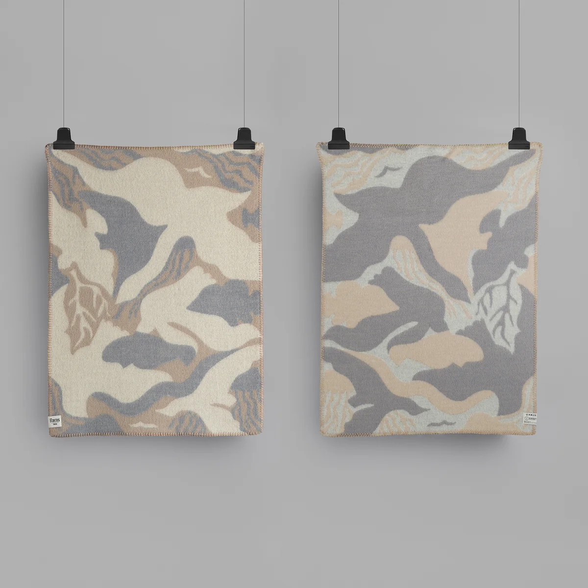The Fugl og Fisk baby wool blanket by Sandra Blikås for the Norwegian manufacturer Røros Tweed. " Fugl og fisk - Bird and Fish" illustrates an exploration of contrasting surfaces influenced by the surrealist M.C. Escher. Whether mirrored, inverted or rotated, this piece seamlessly blends two different motifs into a unified whole.