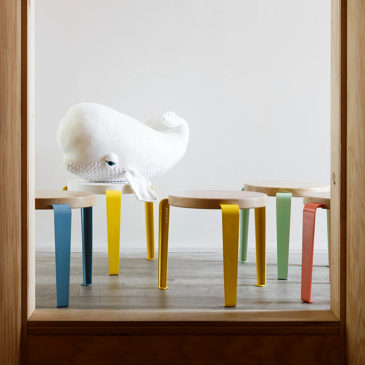 Sustainable children's stool made of wood and steel