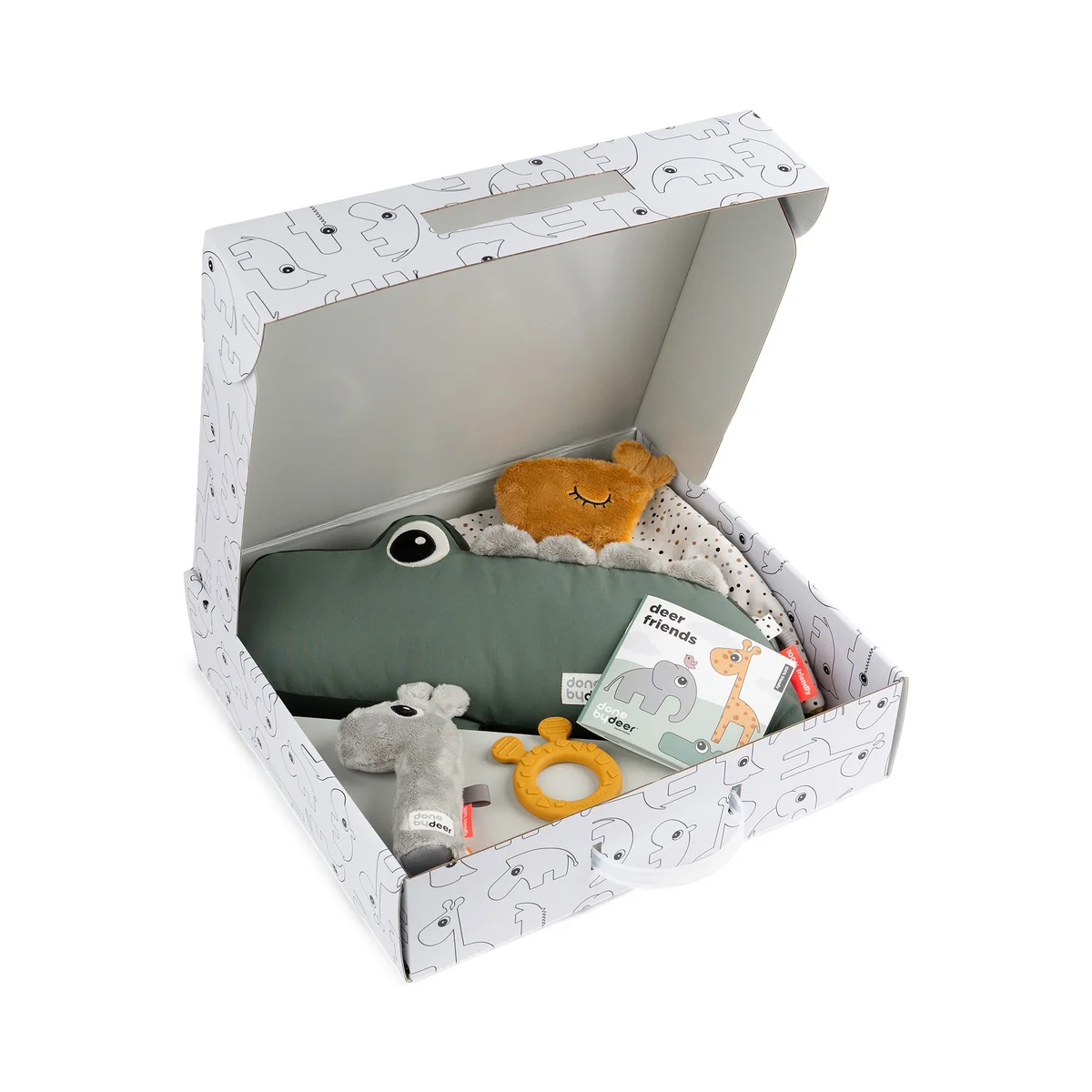 The Play Time gift box from Done by Deer is the perfect compilation of the best-selling baby toys from the Danish company. The set consists of the Tummy Time Activity Toy, the Comfort Blanket with Raffi, a silicone teether and a Squeeker Rattle with Raffi. Play Time is the perfect starter set for the littlest members of the family. Included in the package is a Deer Friends book. Available in a variety of colors.