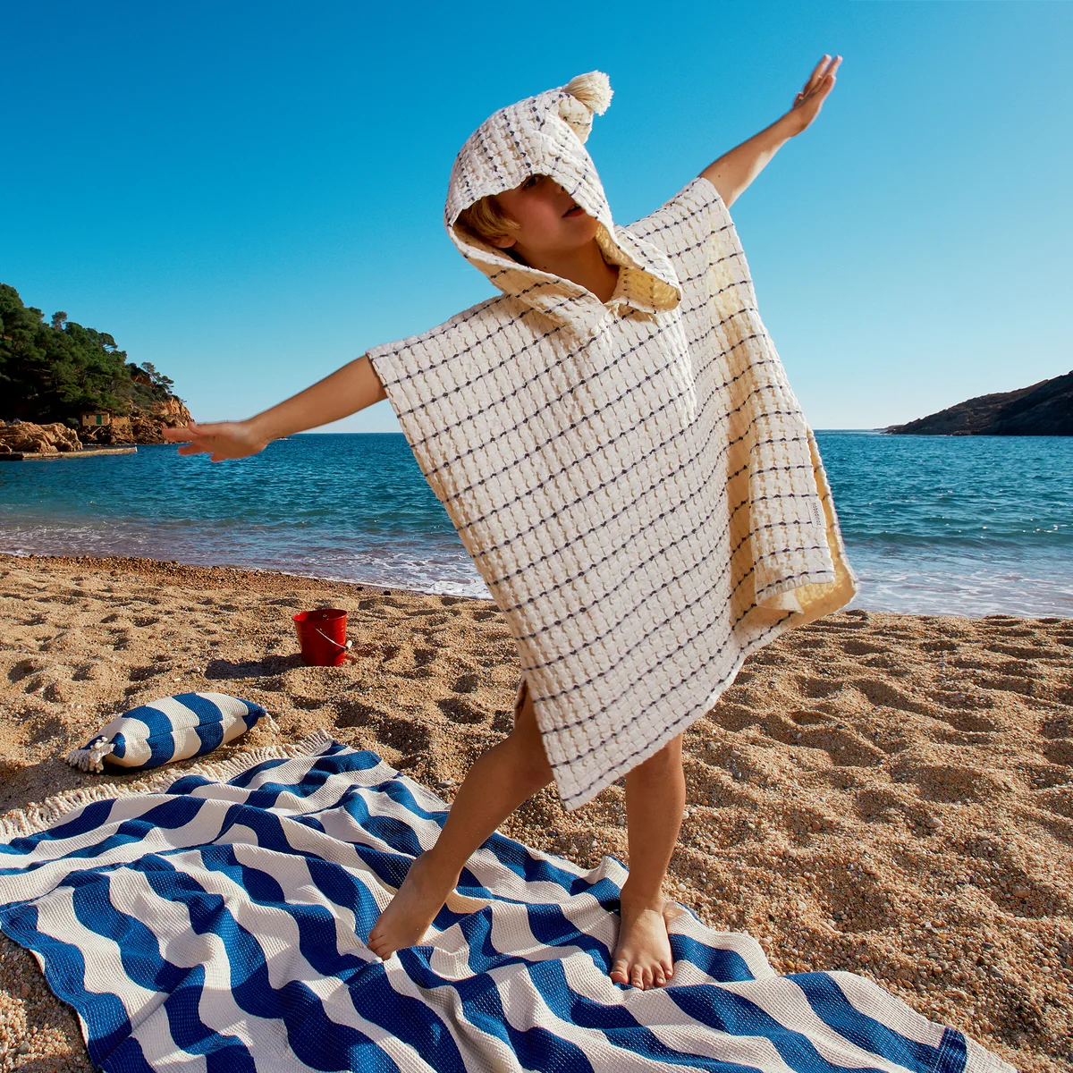 With its playful pom-pom hood, bright stripes and loose fit, the Portofino muslin poncho from Nobodinoz offers children ideal sun protection all summer long. Thanks to the washed organic cotton lining, it is unbeatably soft.