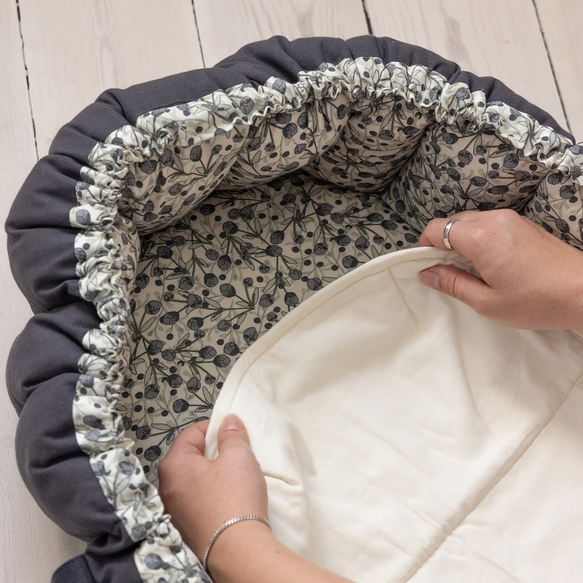 The baby nest fits in baby carriages and buggies and can therefore replace the traditional baby lift. With the sides folded down, it also serves as a large, soft play mat that can also be used for changing nappies.