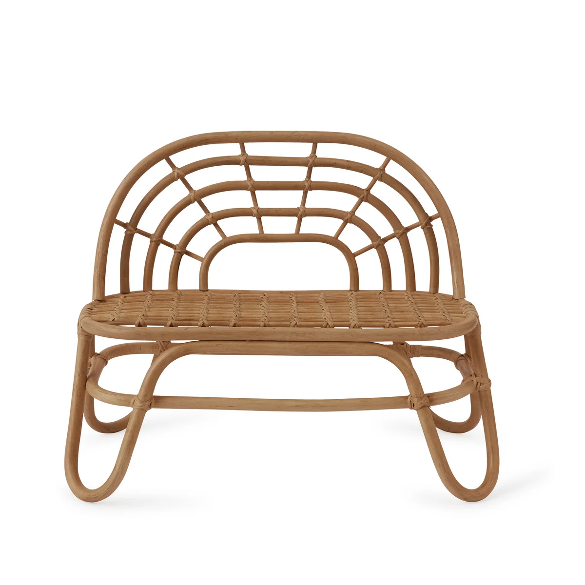 The children's bench is made of rattan. The curved bars as well as the woven seat provide a natural look in the children's room.