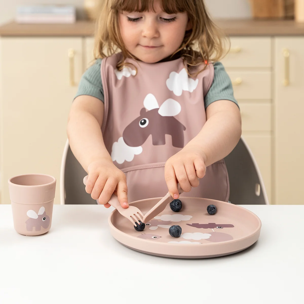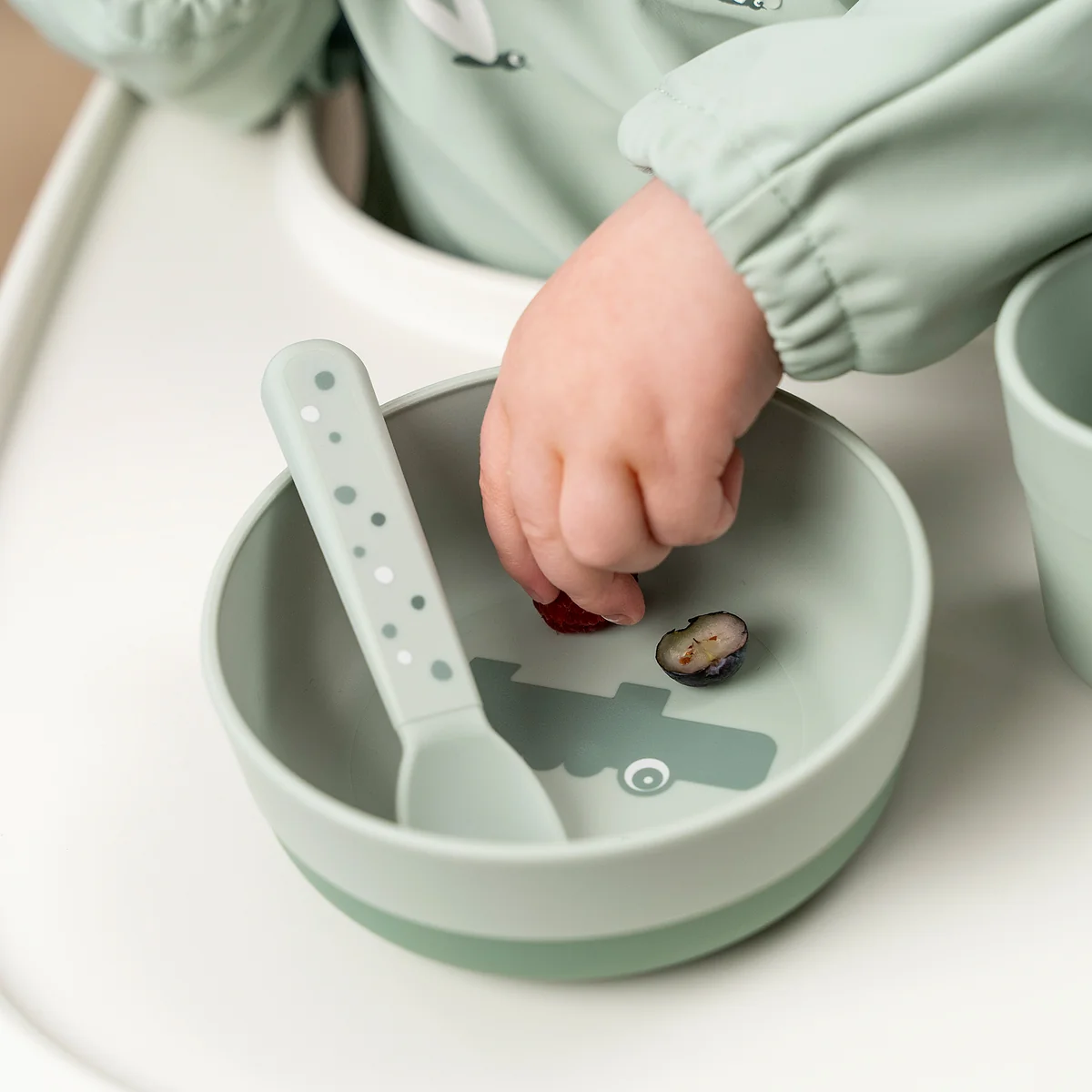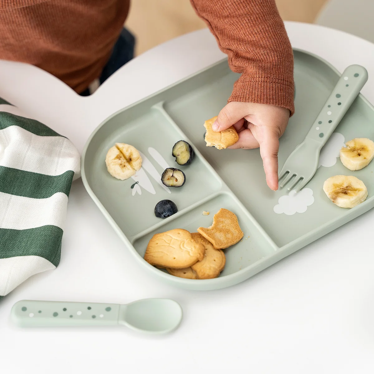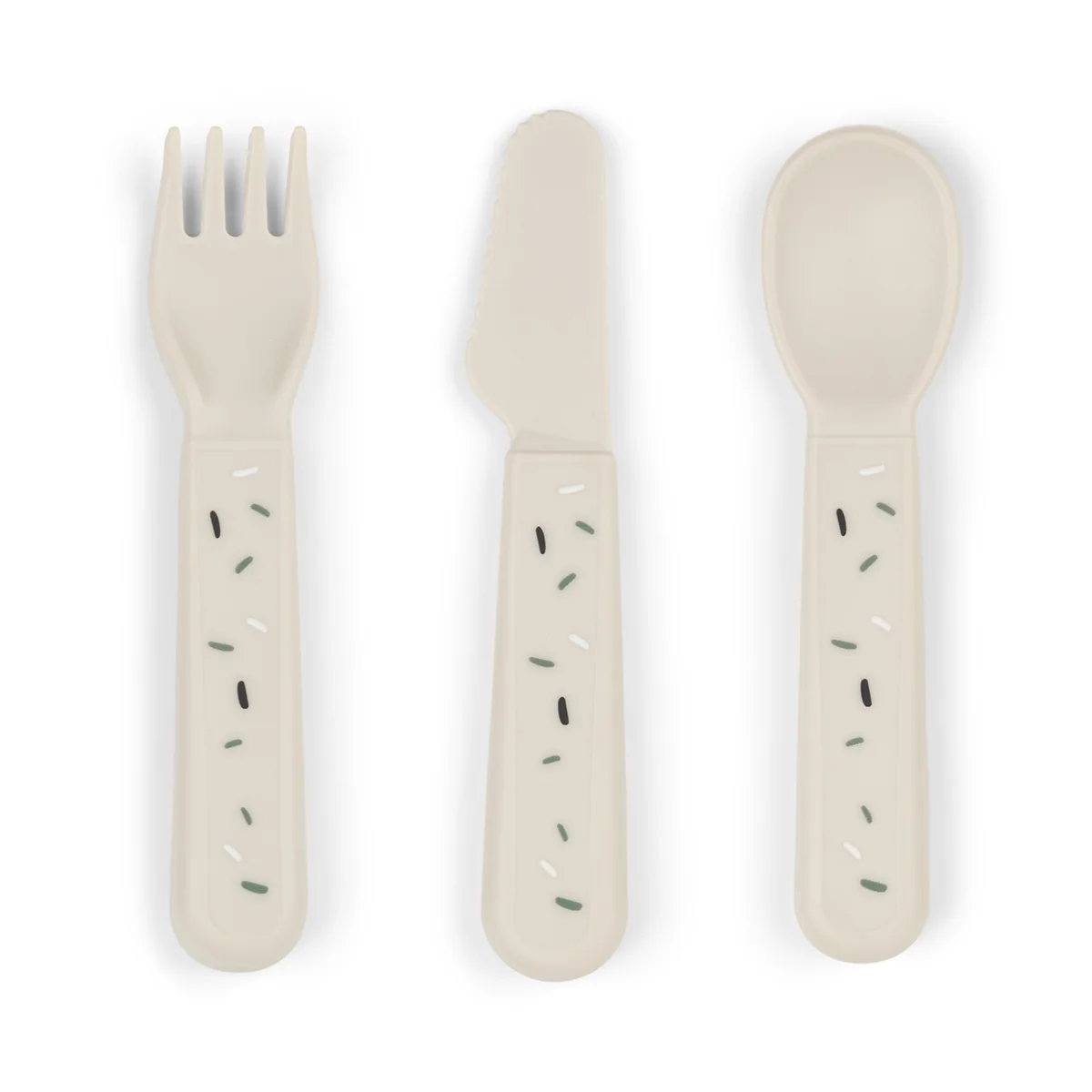 The cutlery set is ergonomically shaped and tailored to the needs of small hands. The rounded edges and child-friendly sizes make it ideal for the first steps towards independent eating.