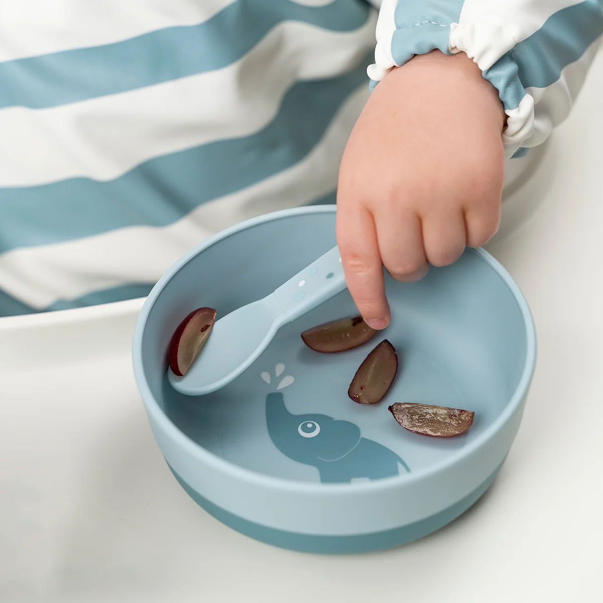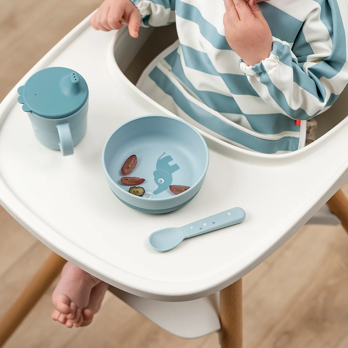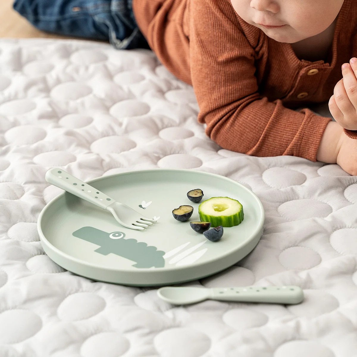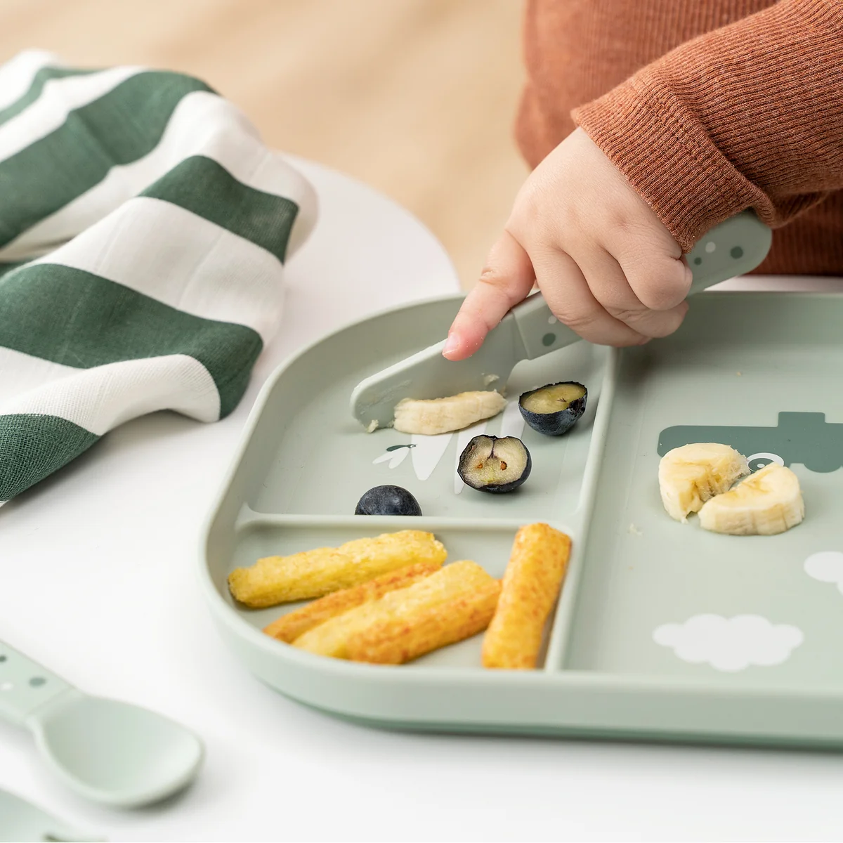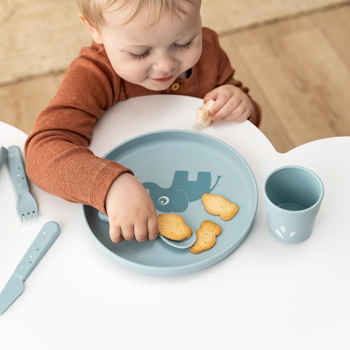 The cutlery set is ergonomically shaped and tailored to the needs of small hands. The rounded edges and child-friendly sizes make it ideal for the first steps towards independent eating.