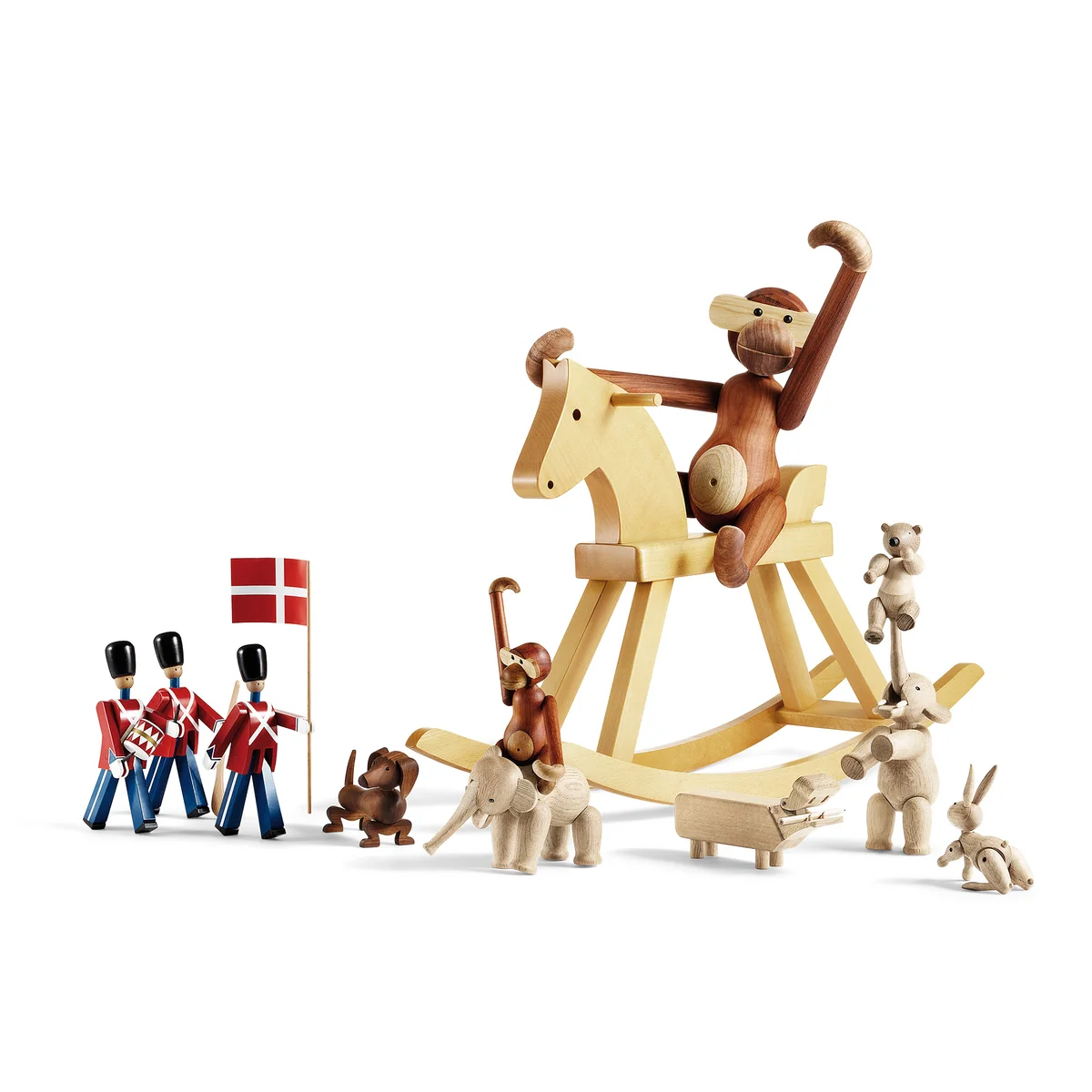The rocking horse from Kay Bojesen is a lovely wooden figure that fits perfectly into the collection of cute wooden figures. The rocking horse is one of the classic motifs that should not be missing in any child's room. With its natural wooden look, it sets accents - whether individually or separately available wooden monkeys and soldiers of the Danish wood manufacturer.