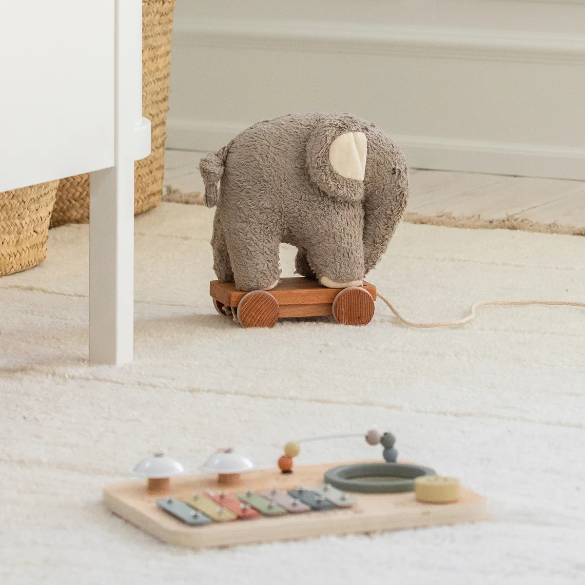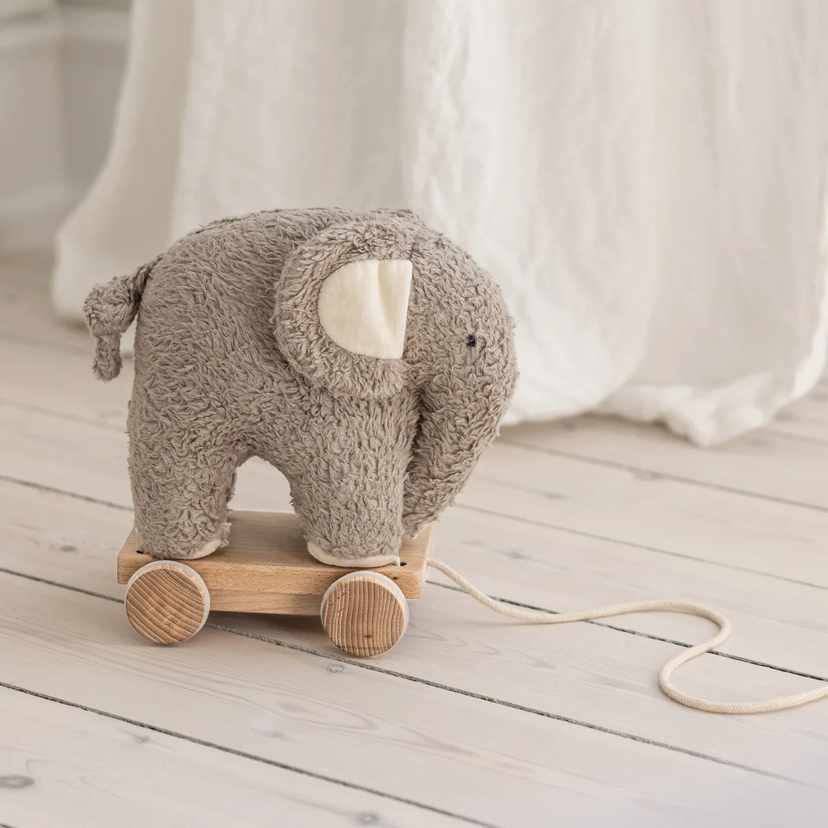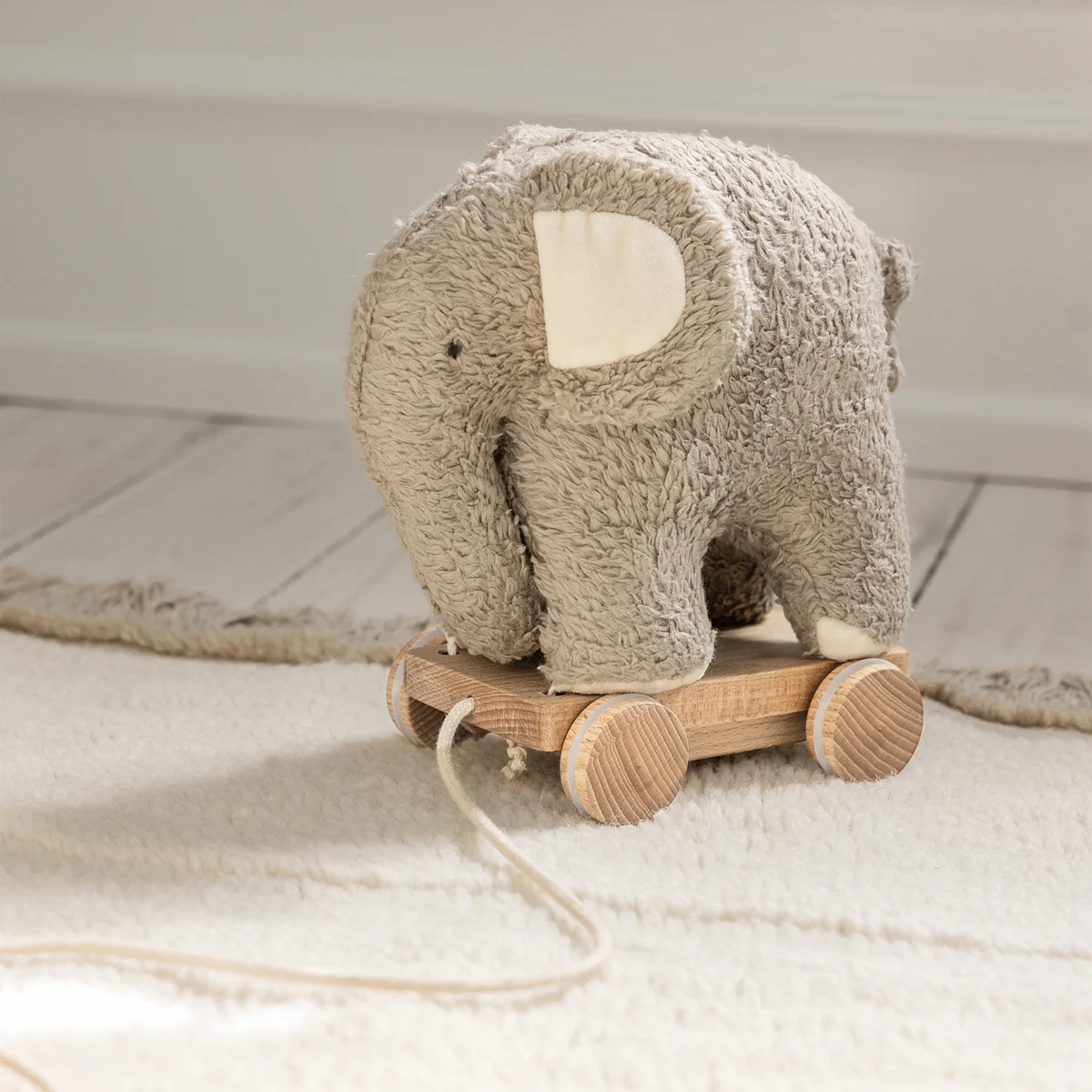 Thanks to the practical cotton pull cord, your child can take the pull-along animal with them wherever they go - on walks around the house or on little adventures in the nursery. And if it gets dirty, the cuddly toy can simply be detached from the wooden base and washed at 30 °C. A charming toy that is also a delightful decorative detail in the nursery.