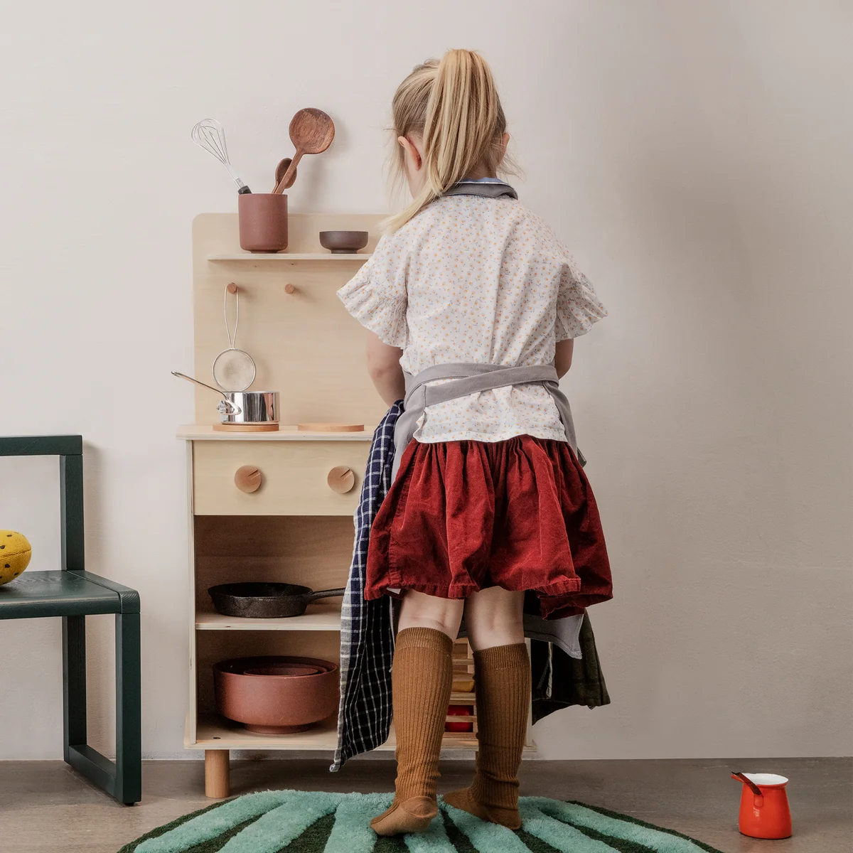 Made of plywood, the kitchen is wonderfully robust and is therefore ideal for use in the children's room. The kitchen has a sink with tap, two hotplates, three hooks and shelves for storage. The small details are made of solid beech wood and stand out slightly from the fronts in terms of colour. The kitchen can be equipped with matching children's crockery from Ferm Living.