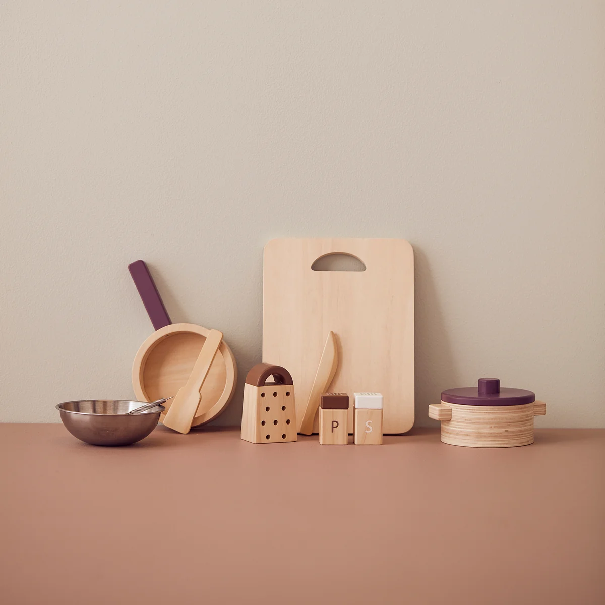The Bistro kitchen utensil set from Kids Concept was developed for imaginative cooking on play stoves. This comprehensive set includes a pot, a pan, a metal bowl with whisk, a grater, containers for pepper and salt, a chopping board and a knife. The entire ensemble is a fantastic addition to any wooden play kitchen, providing hours of fun and unlimited opportunities for creative play. The crockery set serves as a catalyst for imaginative and inventive role play. Incidentally, the knife and chopping board are lacquer-free and can be treated with food-safe oil for added safety.