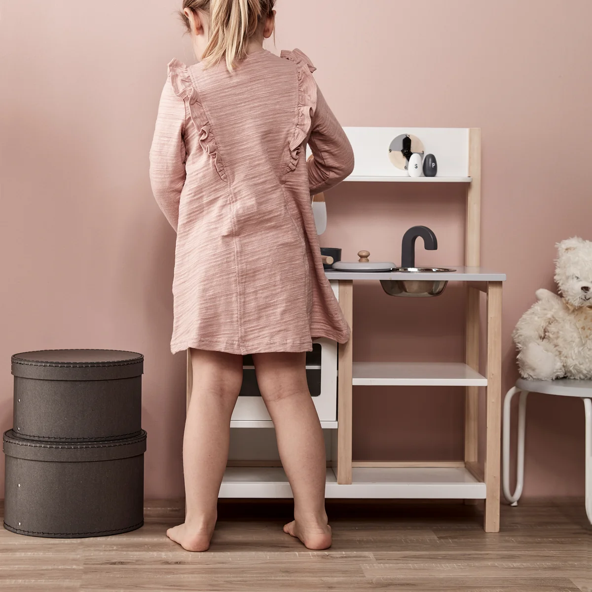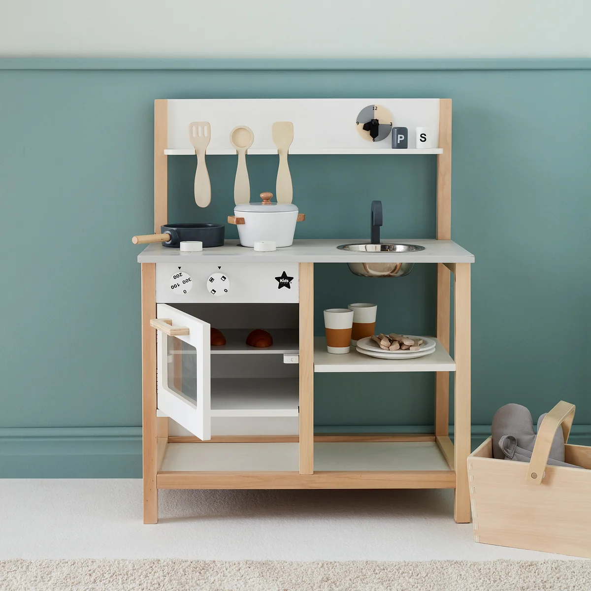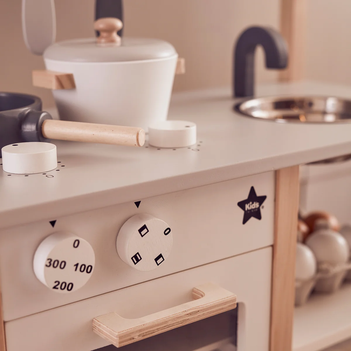 The Bistro play kitchen with accessories from the Swedish company Kids Concept is a stylish kitchen that is ideal for budding young chefs and bakers. The set is equipped with various accessories such as an adjustable clock, pots and pans, a functional oven door, sink and ladles.