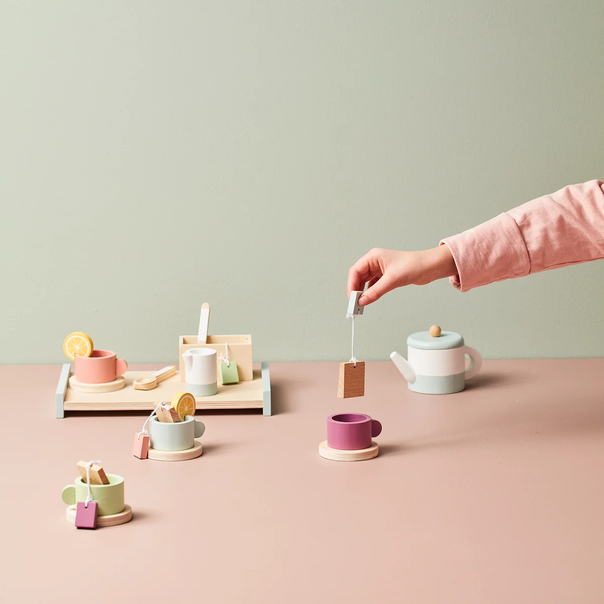 This Bistro wooden tea set from Kids Concept is ideal for stimulating the imagination and is the ultimate addition to any tea party in any playroom. The tea set is made for little hands and is perfect for fantasy scenarios where children can practise pouring tea and milk and adding a slice of lemon.