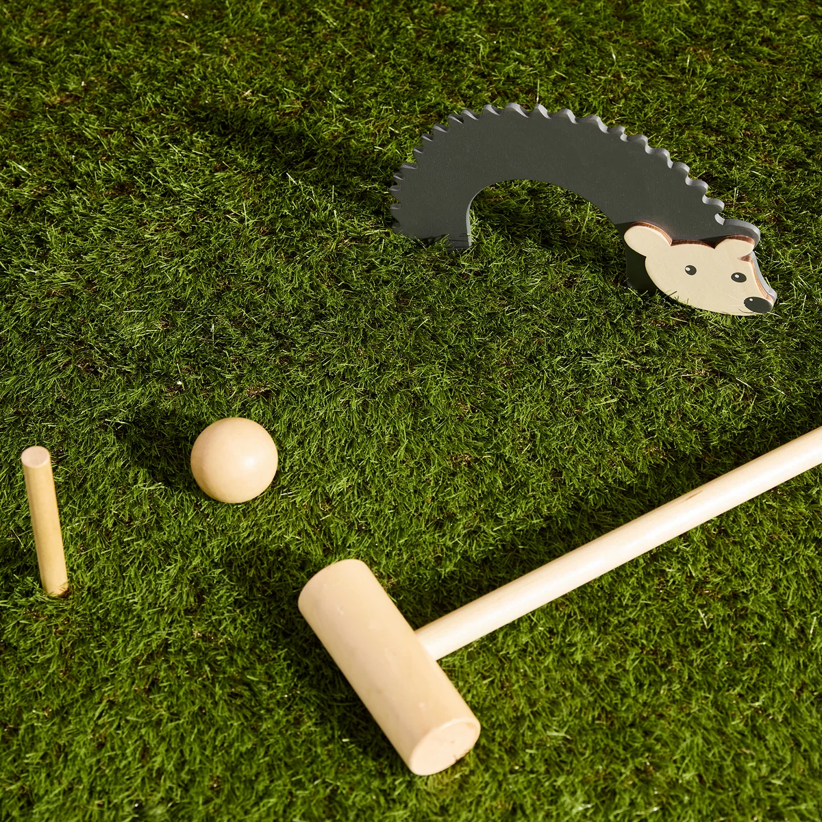 The set includes two croquet mallets, 5 animal hoops, two wooden balls and 2 pegs, all supplied in a practical cotton bag. The bag allows for easy storage and helps the toy to dry after use.