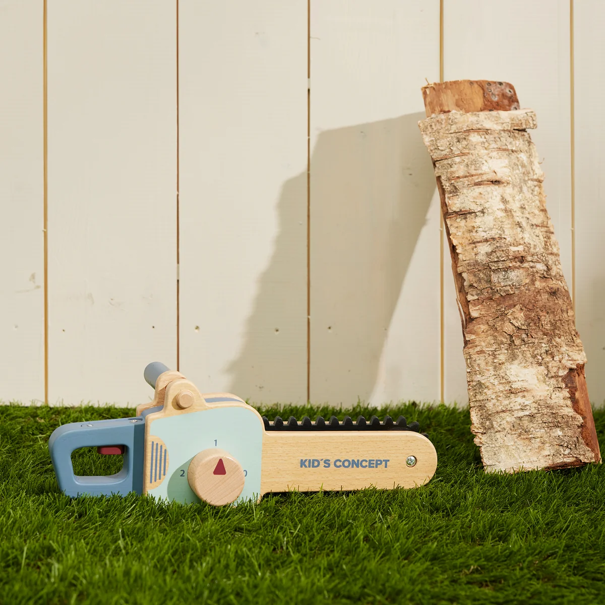 The Kid's Hub chainsaw from Kids Concept made of wood is equipped with a push button and a rotary knob on the side, accompanied by an authentic clicking sound. With its realistic design and easy handling, it brings the fun of DIY work into the world of children.