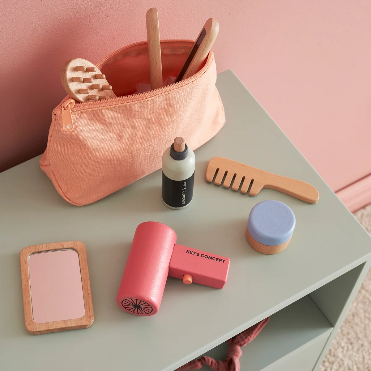 With the Kid's Hub hairdressing set from Swedish manufacturer Kids Concept, every child can unleash their own creativity when soft toys or friends come to visit. The set includes practical functions such as a spray bottle with pump function and a hair dryer with push button, which add a touch of realism to the game. After a visit to the hairdresser, everything can be stored in the practical toiletry bag. The set consists of a mirror, a brush, a comb, a box with lid, a hair straightener, a hair dryer and a spray bottle.
