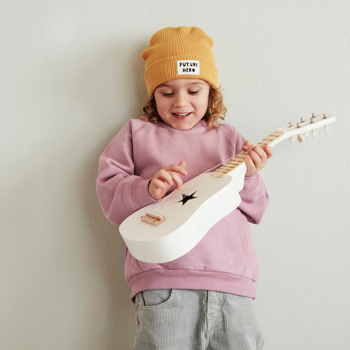The Solid Star children's guitar from Kids Concept is the perfect way to awaken children's love of playing instruments and creating their own sounds. This guitar is not only a delightful toy, but also a charming furnishing element for the child's room or any other room in any home, providing a lively accent in place of a traditional cushion or picture. The strings can be stretched like a normal guitar, making it an ideal toy for music-loving children or to encourage an early interest in music.