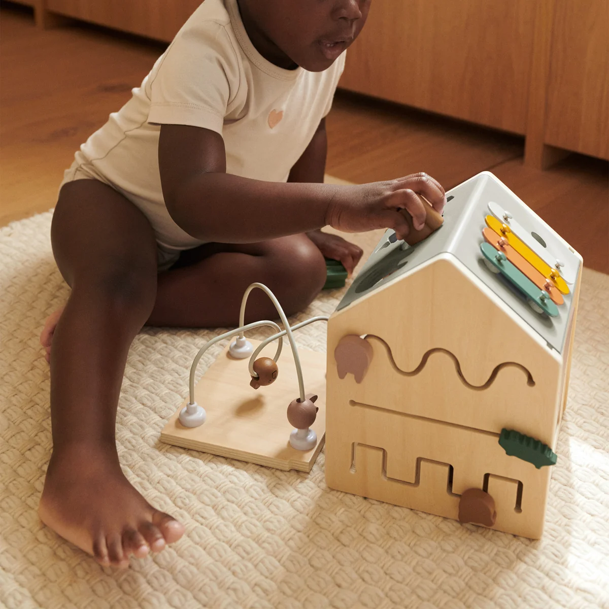 The minimalist, softly colored design fits harmoniously into any nursery and at the same time makes Lucas a stylish, functional play accessory. Robust workmanship and high-quality materials ensure that the activity toy can withstand even small everyday adventures.