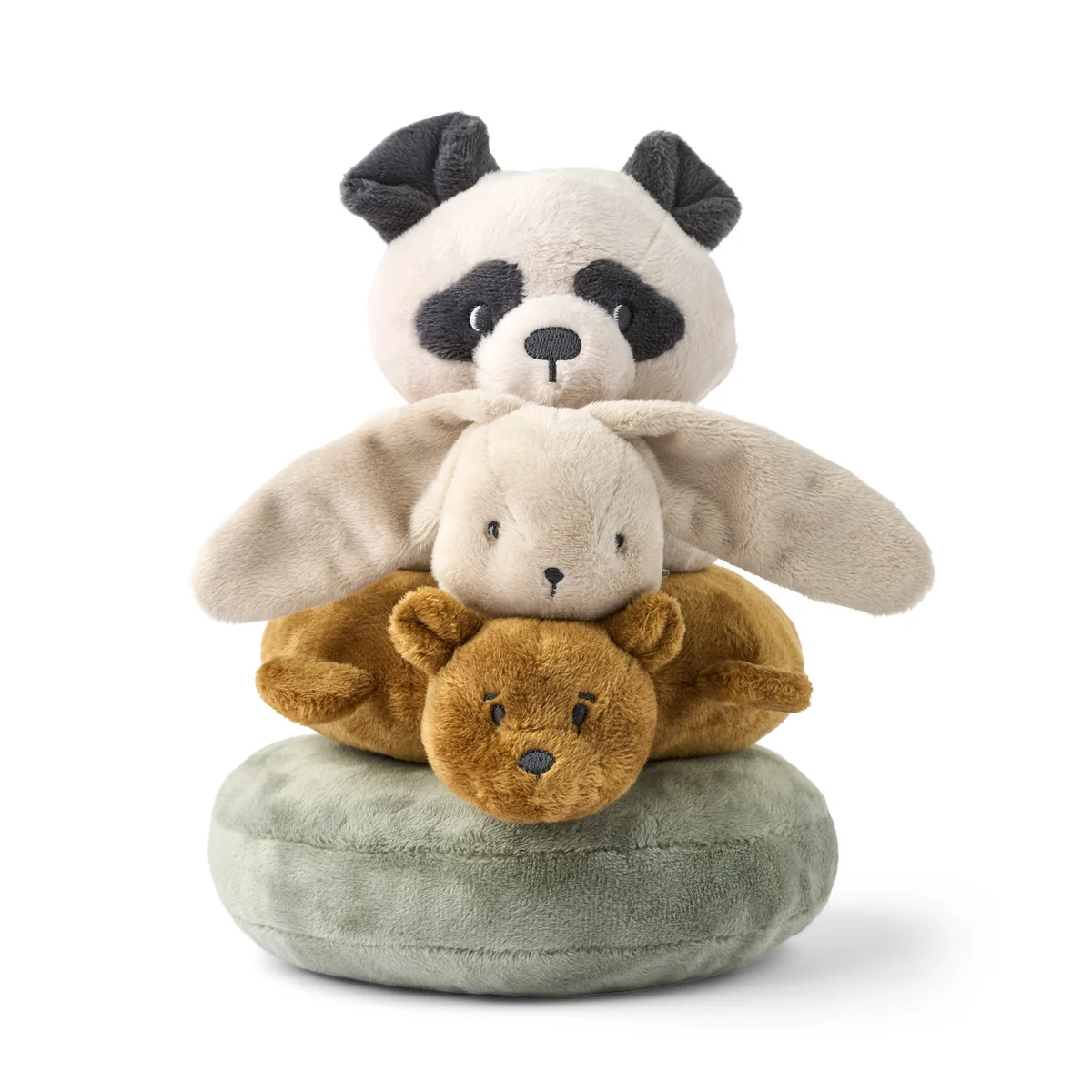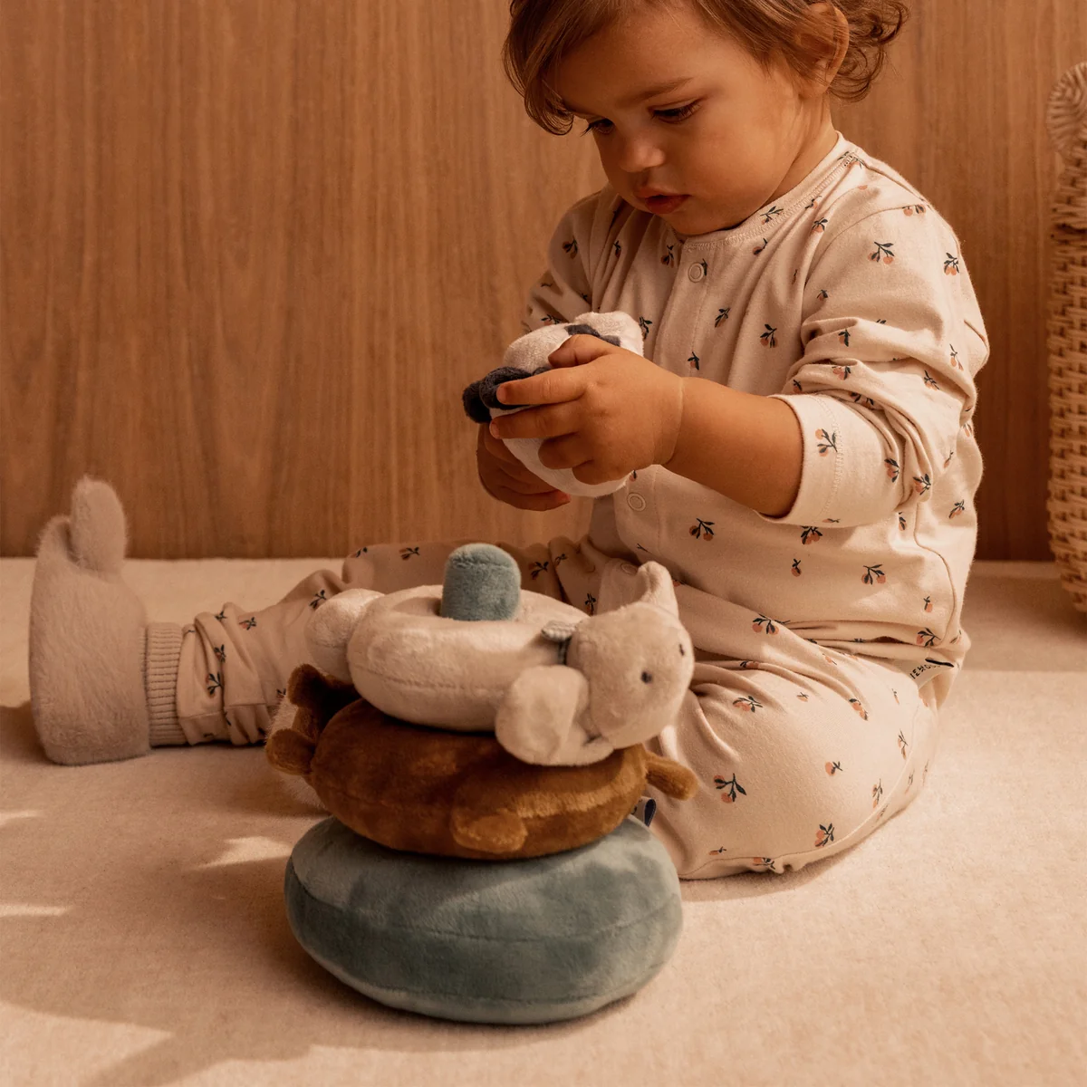 The Sannie stacking tower from LIEWOOD , available in the Connox home design store, is a lovingly designed learning toy made of soft plush. Each ring is shaped like an animal and filled with crackling fabric and little bells so that it can also be used individually as a rattle. Stacking playfully trains fine motor skills, stimulates the senses and provides lots of fun. Made from 100% GRS-certified recycled polyester, the stacking tower combines sustainability with a high cuddle factor - ideal for little explorers.