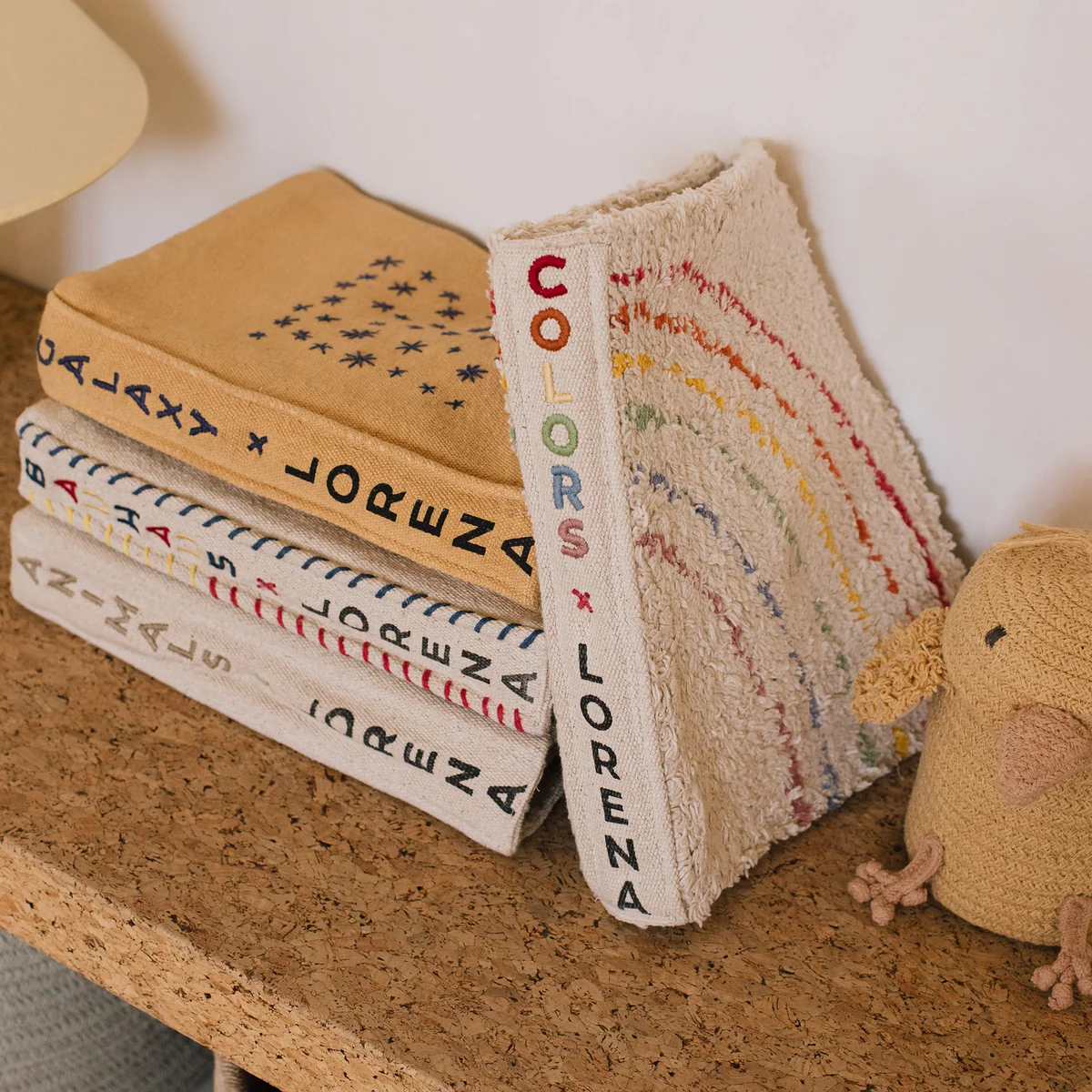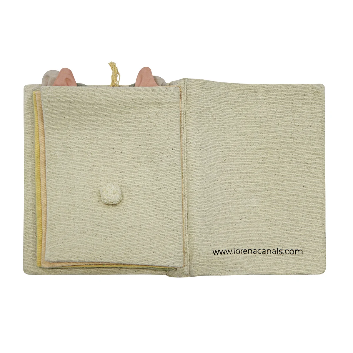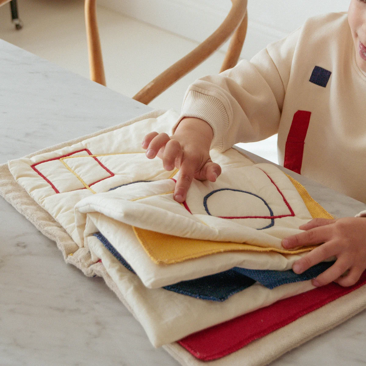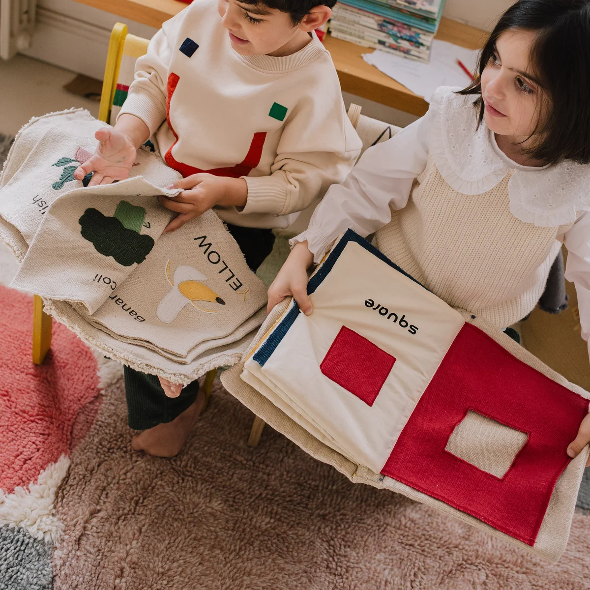 This handmade activity book from Lorena Canals features colorful play elements on brightly colored cotton cloths that are decorated with elaborate embroidery and stimulate the sense of touch. The plush cover provides additional sensory pleasure.