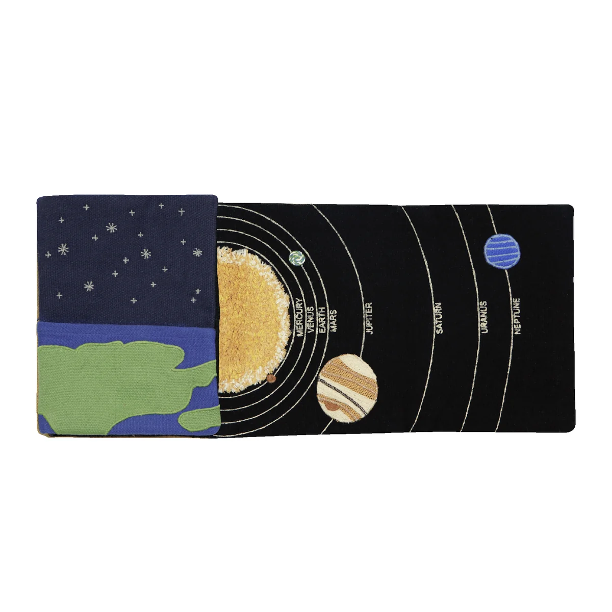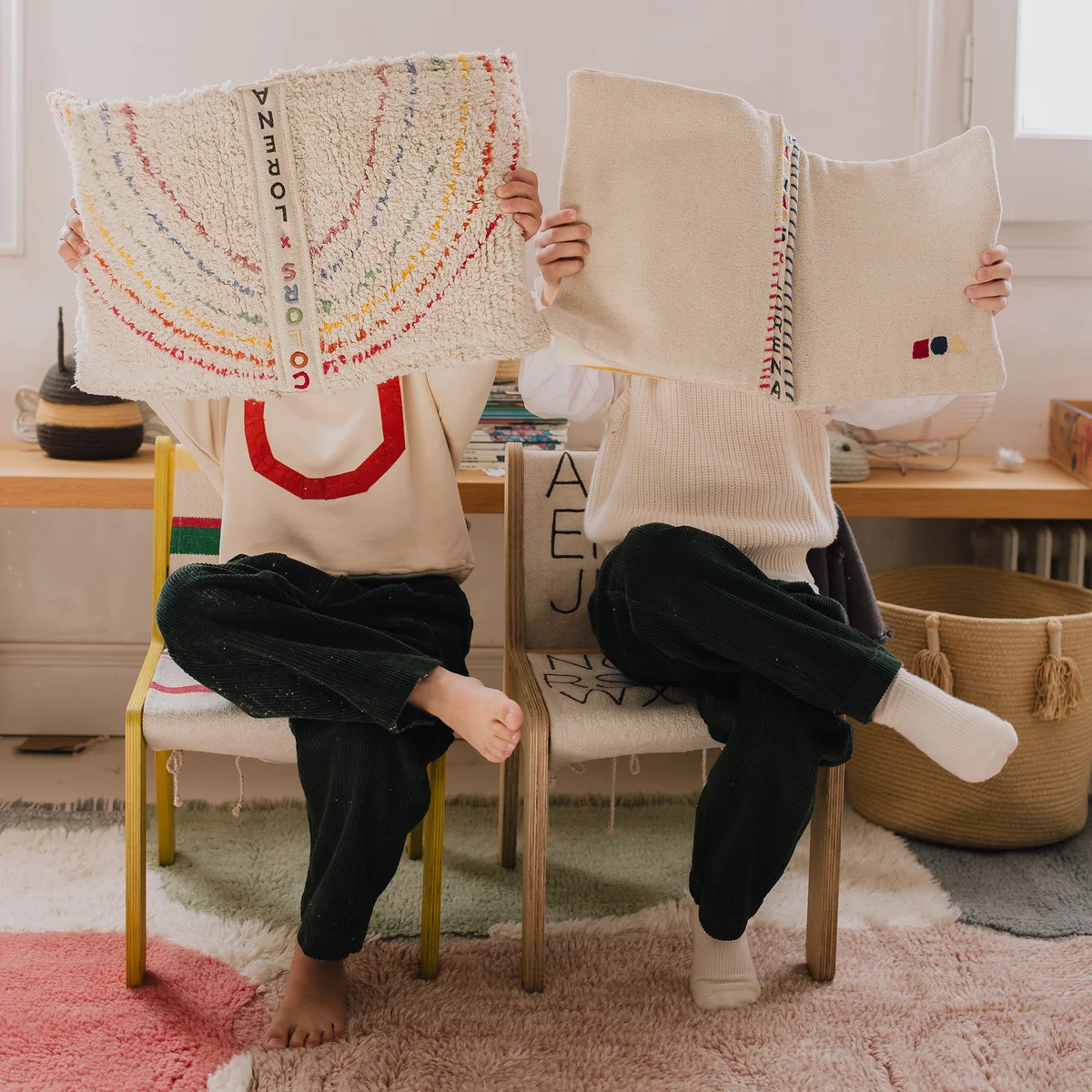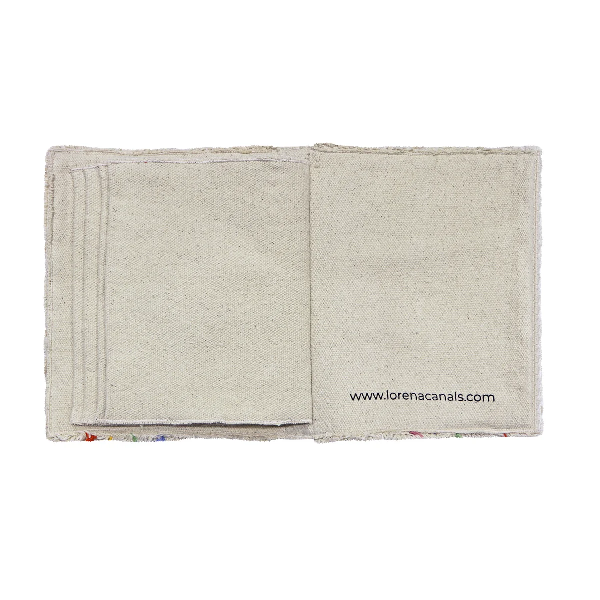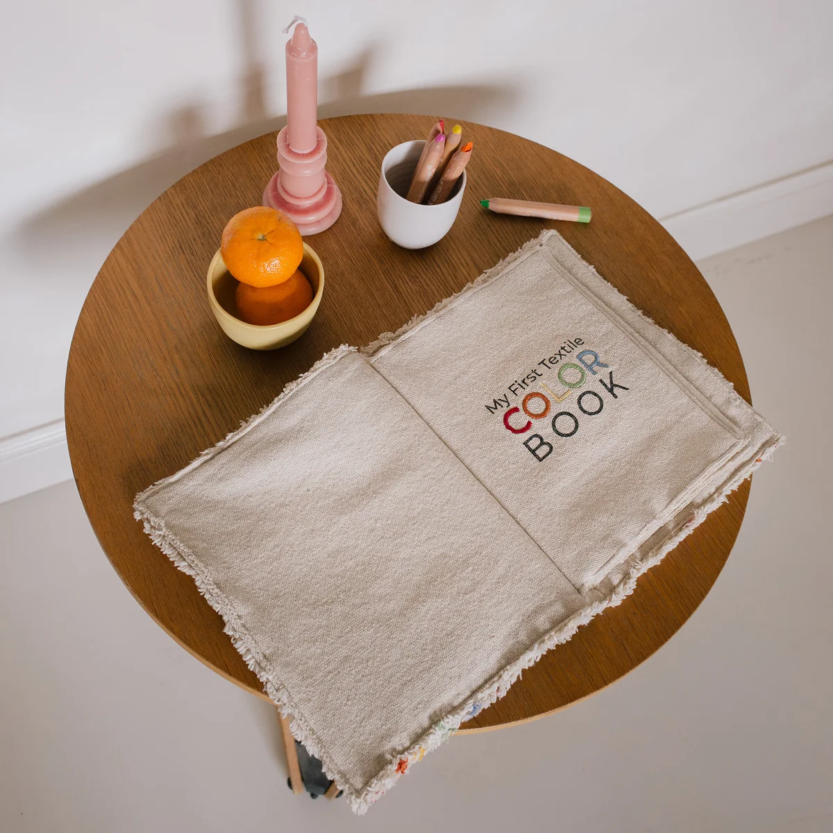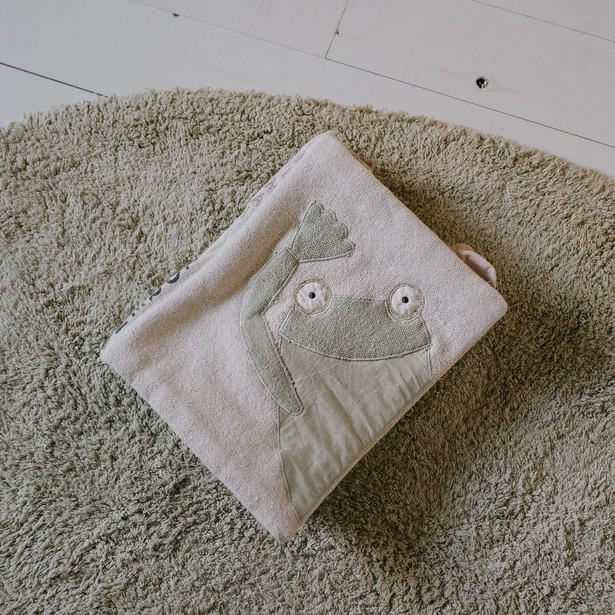 This handmade activity book from Lorena Canals features colorful play elements on brightly colored cotton cloths that are decorated with elaborate embroidery and stimulate the sense of touch. The plush cover provides additional sensory pleasure.