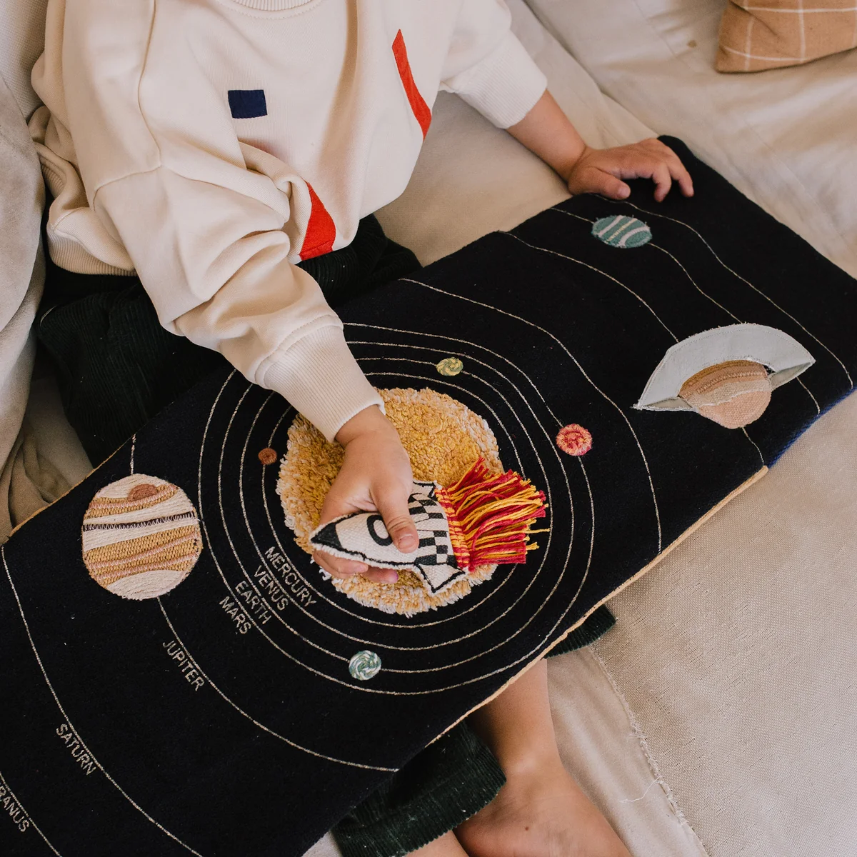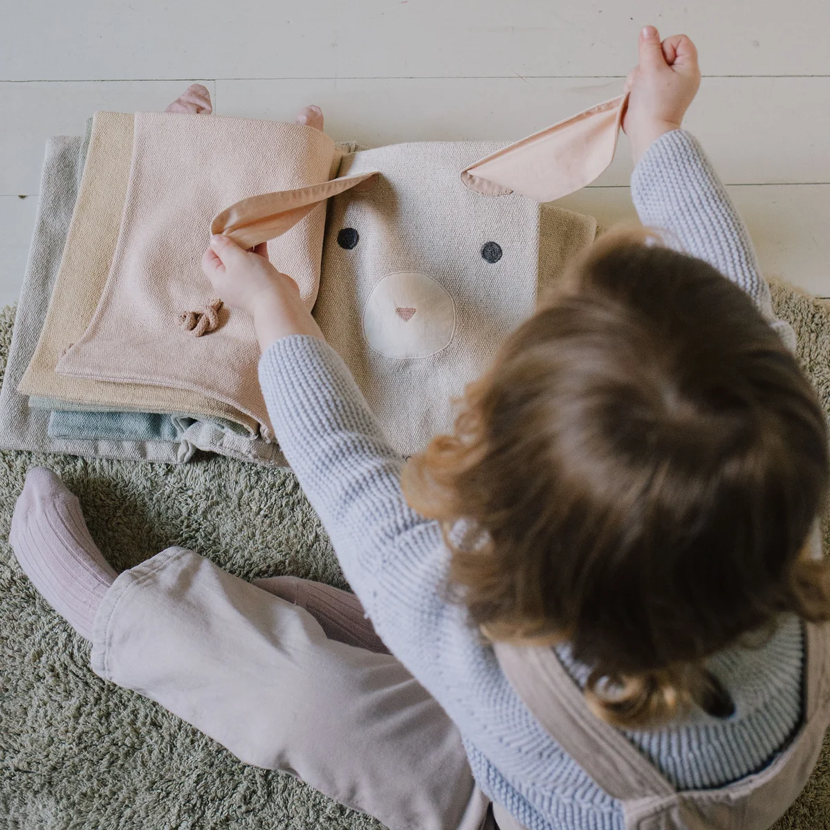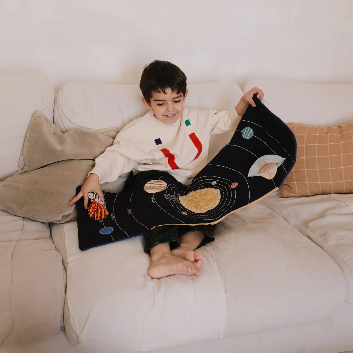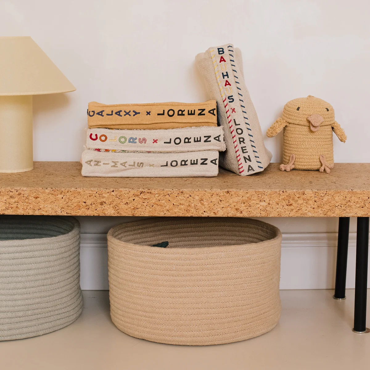 This handmade activity book from Lorena Canals features colorful play elements on brightly colored cotton cloths that are decorated with elaborate embroidery and stimulate the sense of touch. The plush cover provides additional sensory pleasure.