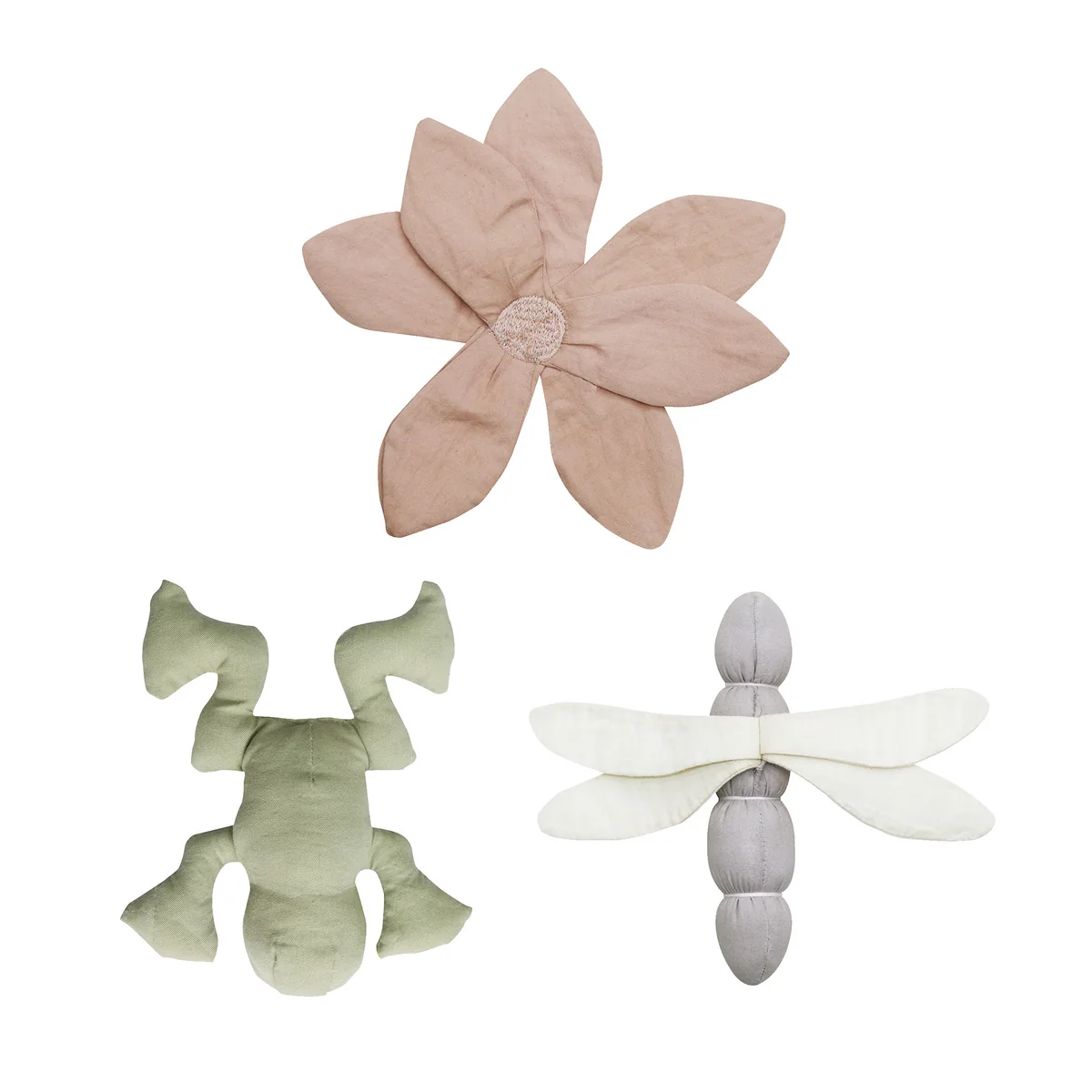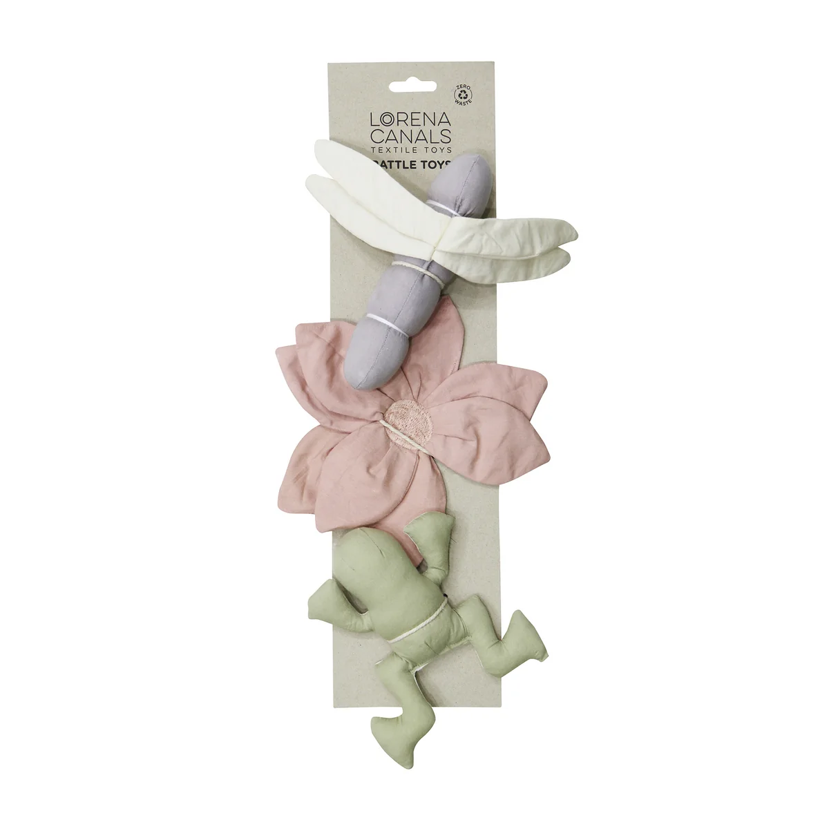The baby activity toys from the manufacturer Lorena Canals trains all the senses of the smallest family members! The crackling and rattling of the toys makes for extremely fun play moments. The set of 3 consists of a water lily, a frog and a dragonfly. If necessary, the play elements can be cleaned wonderfully simple in the washing machine. The covers are made of organic cotton, the filling consists of recycled polyester, as well as cringle paper and rattles.