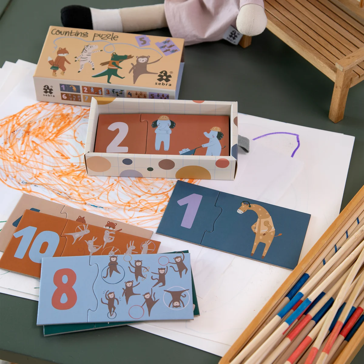The puzzle with numbers from the house Sebra combines playing and learning in a wonderful way. The beautiful counting puzzle made of FSC™️ certified wood show numbers from 1- 10. A total of 10 pairs, 20 parts in total, show cute characters from the Sebra Kosmos.