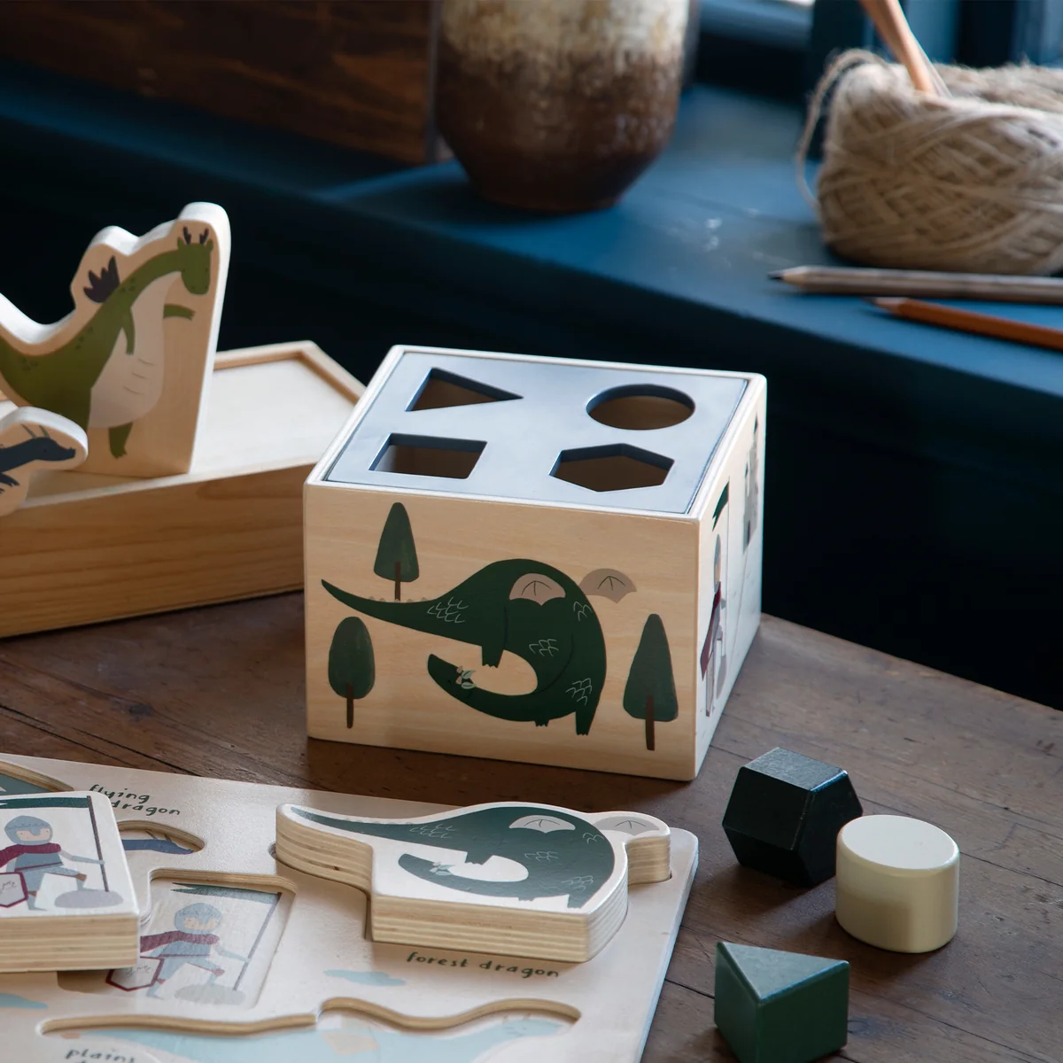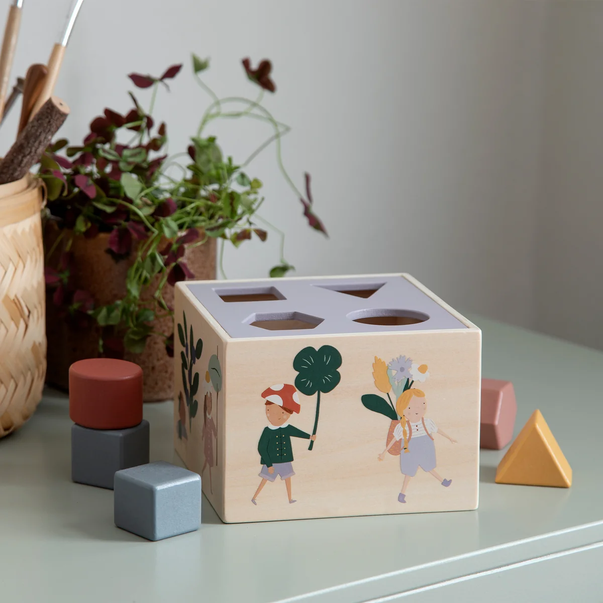 The shape plug-in game from Sebra consists of a box on which cute illustrations with motifs from various themed worlds are depicted. The lid has four holes in different geometric shapes. The eight plain colored blocks are made in the same shapes and fit into the holes of the box.