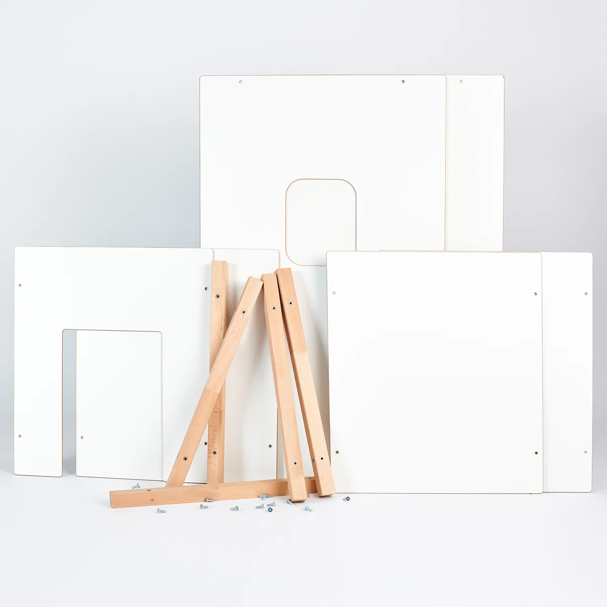 The wand children's playhouse and room divider from Tojo combines functionality and fun. Six play walls in different sizes can be built up as desired. The walls are plain or have cut-outs for doors and windows. They are simply connected to each other via corner joints and can be varied at any time. This creates a small house or a long wall with doors and windows. Either way, the wand children's playhouse offers fun and games for young and old. At the same time wand At the same time, its size also serves as a fun room divider and can, among other things, playfully separate the play area from the sleeping area.