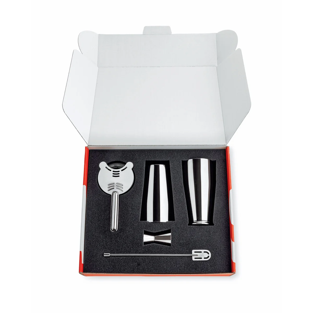 The Boston Cocktail Set from Alessi is a professional bar set consisting of an American " Boston "-Shaker, a bar strainer, a bullhorn and a measuring cup. Whether Caipirinha, Cosmopolitan or Margarita - an exuberant cocktail party is guaranteed with the Boston Don't put anything in the way! It was designed by Ettore Sottsass and Alberto Gozzi.