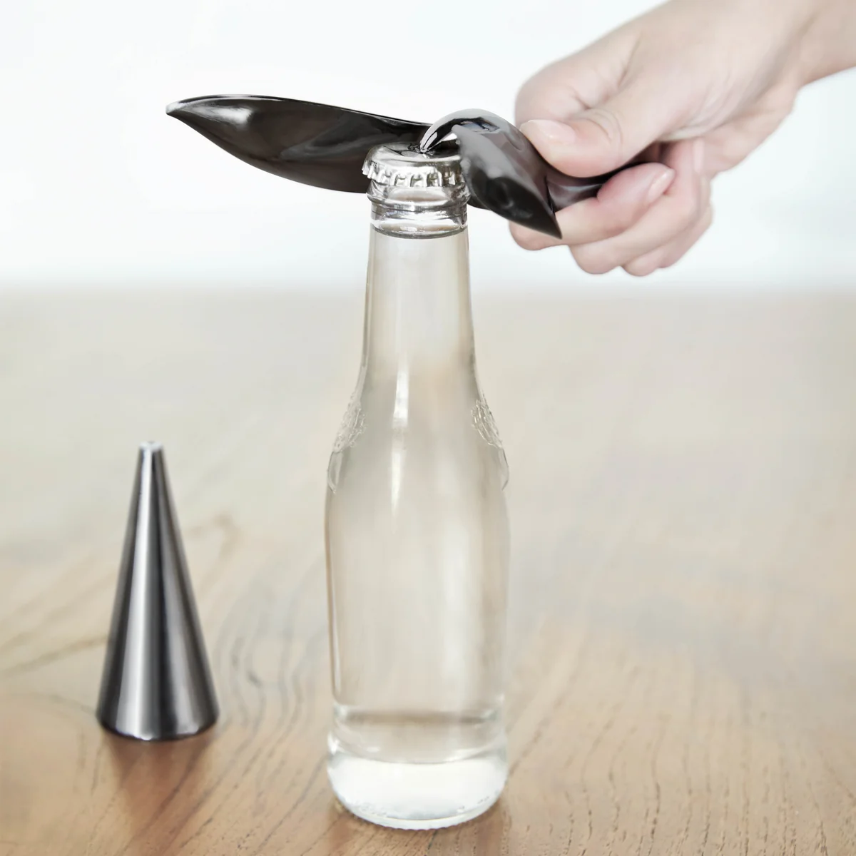 The Tipsy Bottle opener from Umbra is a bar accessory that does not have to hide behind the counter. Tipsy is both decorative and functional: like a delicate bird, this bottle opener balances on its own stand or on any edge surface and is guaranteed to become the topic of conversation at any wine or beer evening.