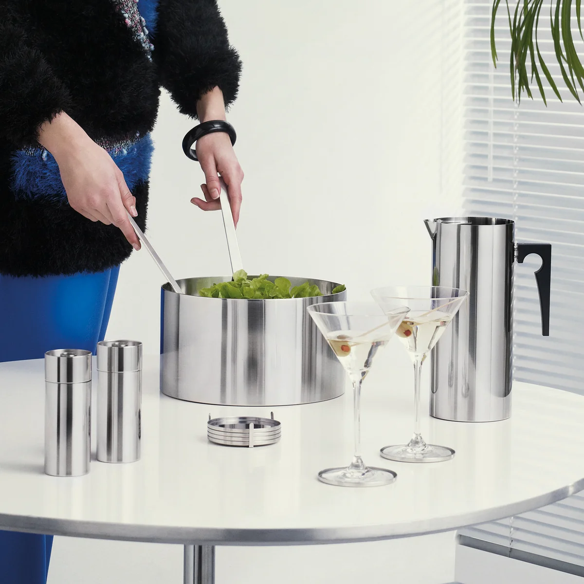 The straight shape and simple design of the jug is still modern today. The ice stopper keeps ice for cooling the beverage in the jug and prevents the ice cubes from falling into the glasses. Since 1960, it has been the goal of Stelton to produce high-quality tableware and serving utensils out of stainless steel.