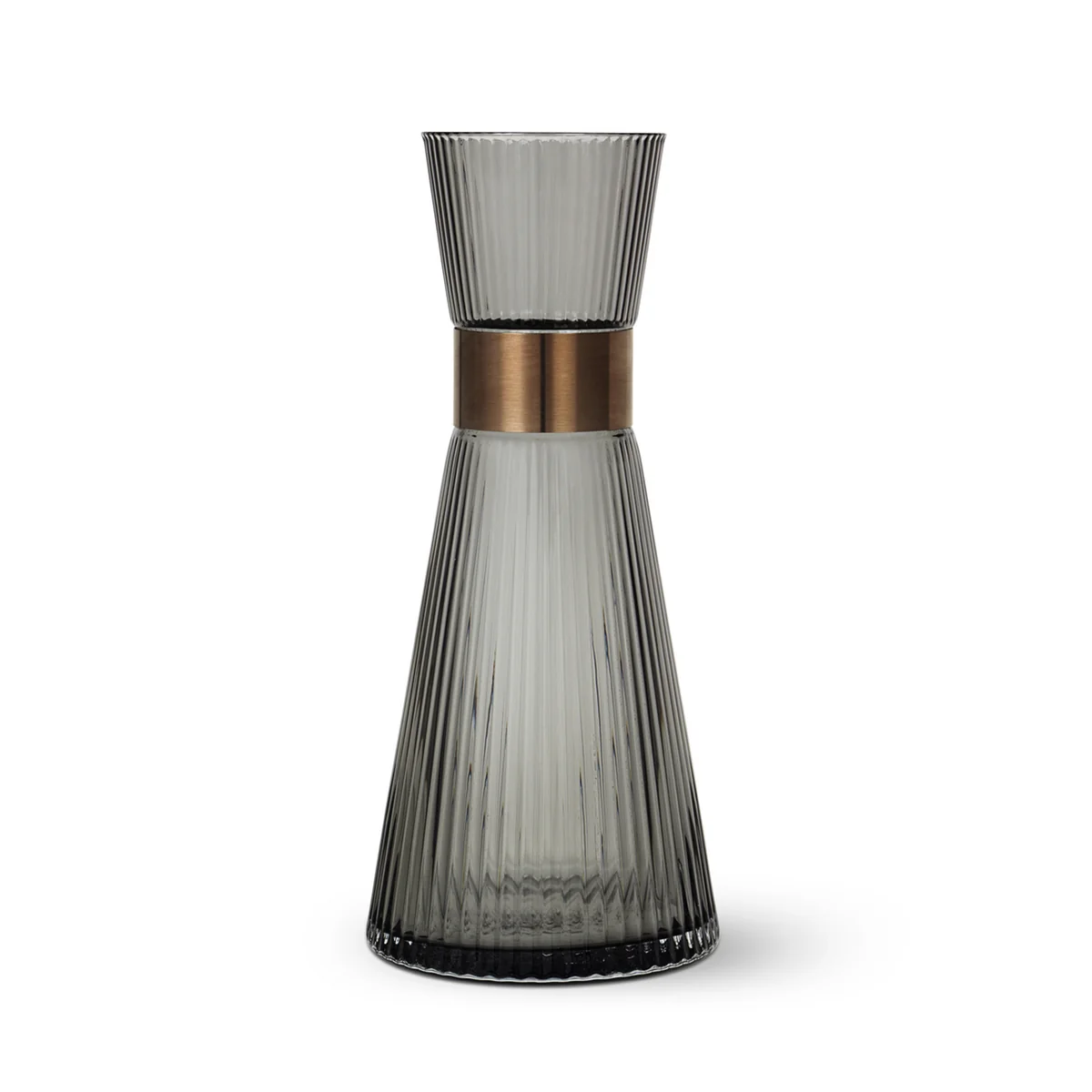 Made from high-quality mouth-blown glass, the carafe is particularly light and elegant. The surface is adorned with repeating grooves. These create a subtle visual effect when the carafe hits the light. The carafe has a patinated steel band that gives it an additional touch and forms an aesthetic interruption in the design of the grooves between the body and lid.