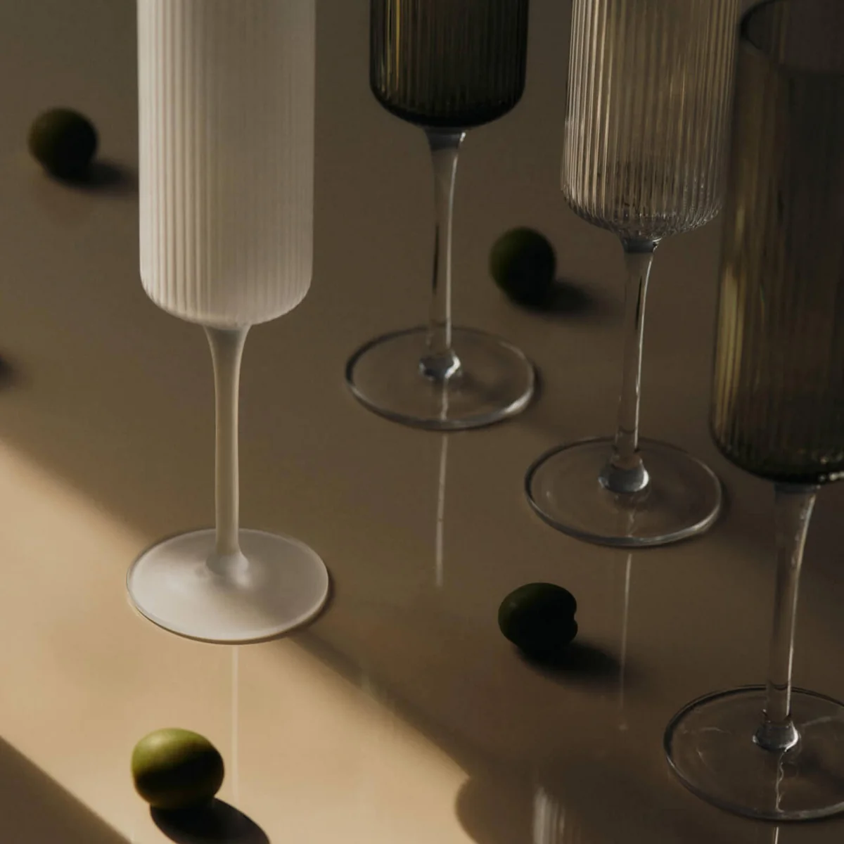 The Ripple champagne flute from Ferm Living extends the popular Ripple -series with an elegant glass for special moments. The mouth-blown flute is blown into a mold and is distinguished by its characteristic, finely fluted surface, which gives the glass dynamism and structure. The tall, slender silhouette helps the bubbles to rise and optimally preserves the aroma of sparkling wines. Whether for a festive reception or a stylish toast - this glass combines function and design in a contemporary way.