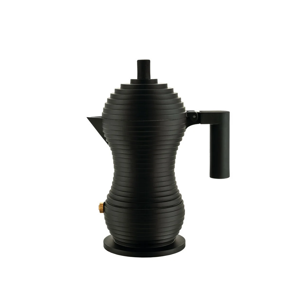 The Pulcina espresso maker by Michele De Lucchi for Alessi is made of cast aluminum and is available in different sizes and colors.