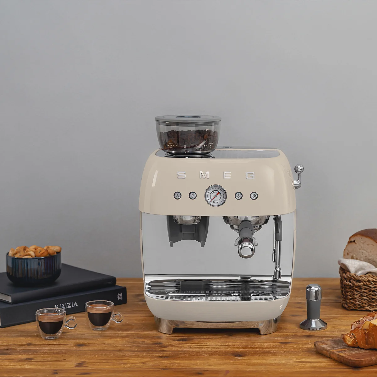 The espresso machine with portafilter EGF03 by Studio deepdesign® for the Italian manufacturer Smeg is an indispensable must for all coffee lovers! The espresso machine with integrated coffee grinder prepares a bouquet of wonderful flavors through even grinding. Depending on preference, the grind of the stainless steel cone grinder can be adjusted. The upper grinder can also be removed for convenient cleaning.