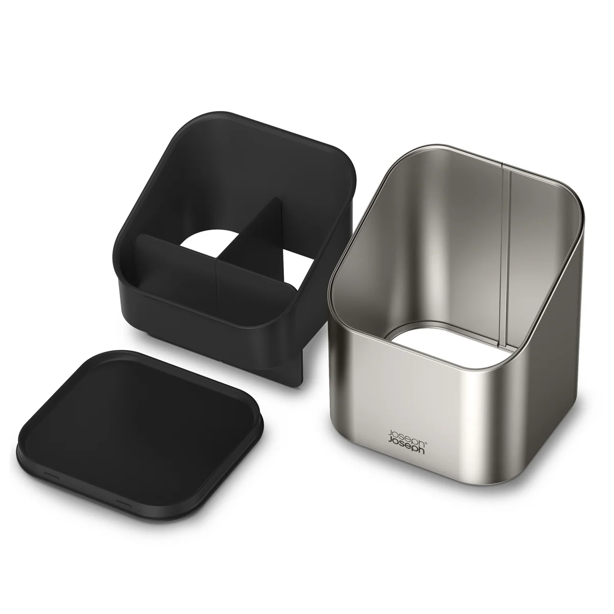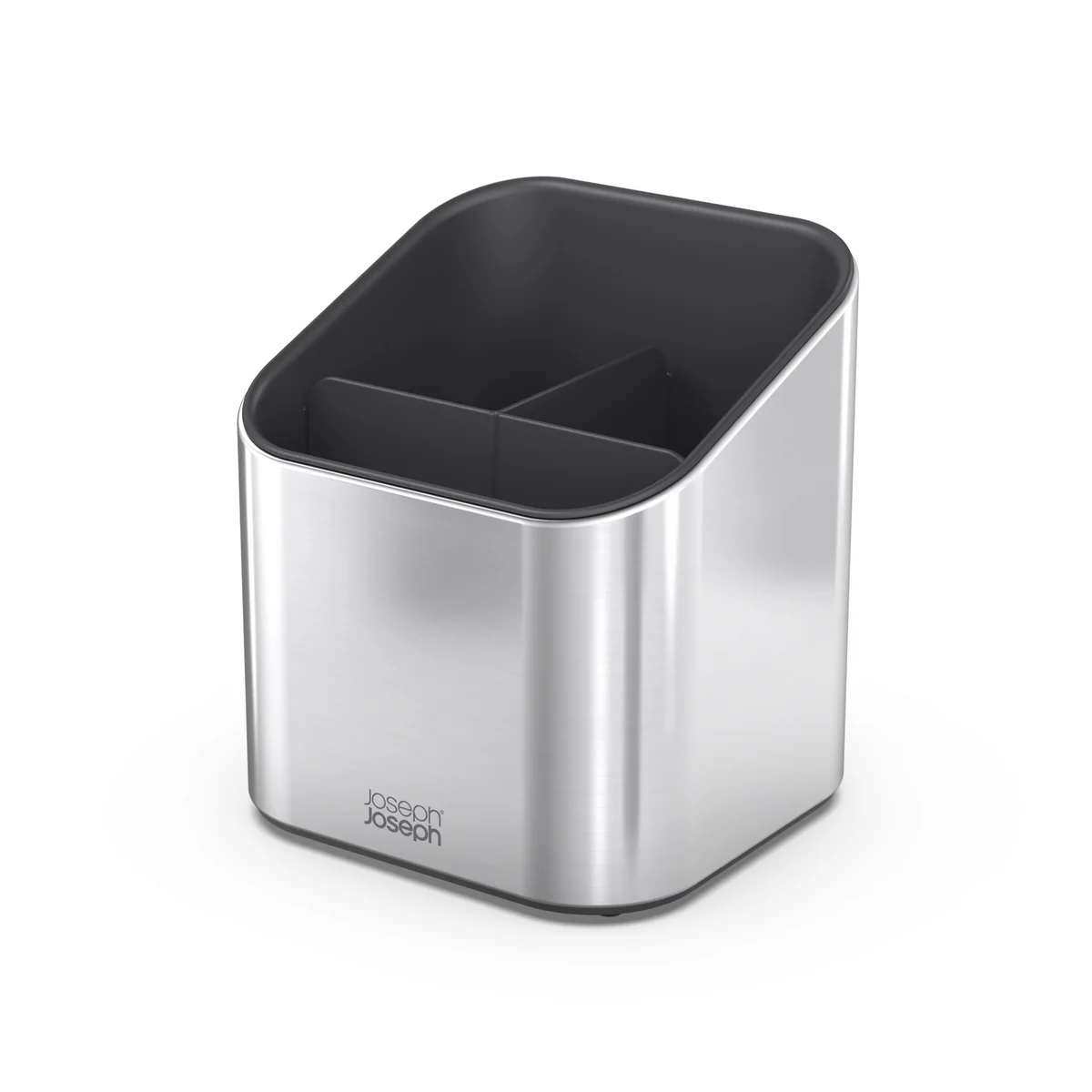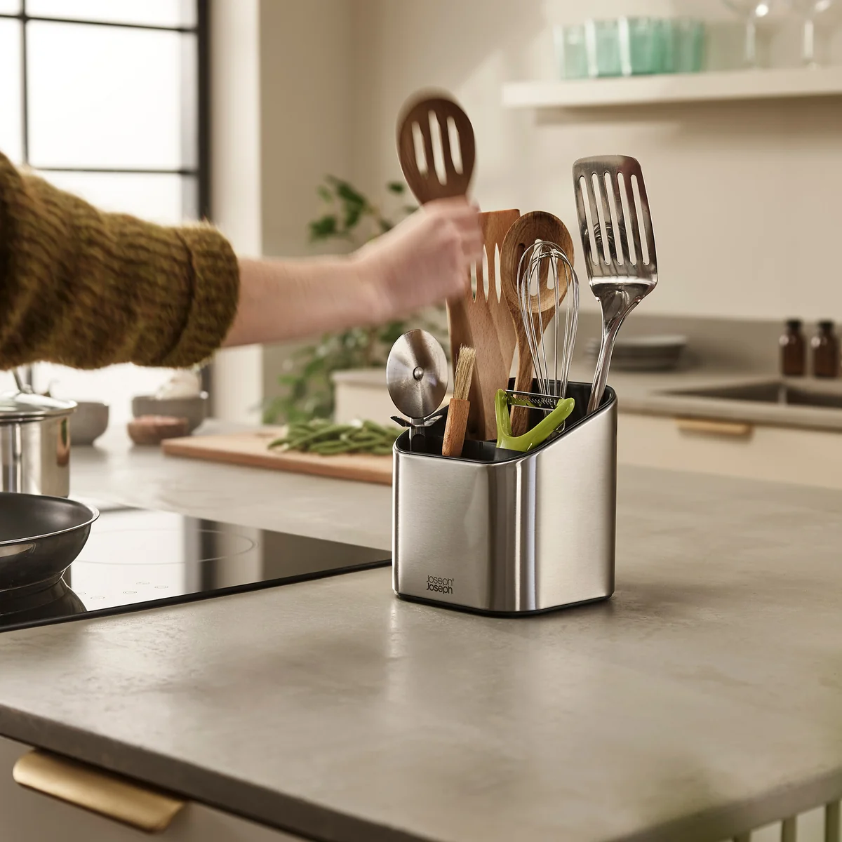 The Surface Stainless steel utensil container of the British manufacturer Joseph Joseph can be used multifunctionally in the household. All kinds of utensils with long handles or small kitchen gadgets like peelers can be stored optimally. Depending on personal preference can Surface also be used in the bathroom for cosmetics. Thanks to the beveled design, access is facilitated. The extremely robust stainless steel housing is fingerprint-proof, has non-slip feet and can be easily disassembled and cleaned by hand.