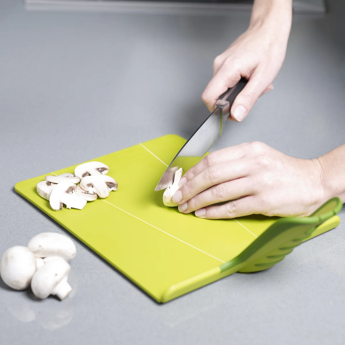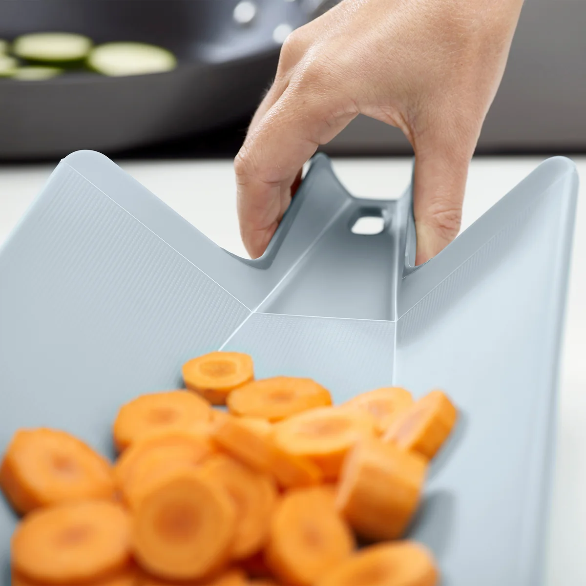 Chop2Pot Plus is the improved version of the prize honored foldable chopping board Chop2Pot from Joseph Joseph. Besides the proven hinges, Chop2Pot Plus possesses a pleasantly smooth handle and an anti-slip base.