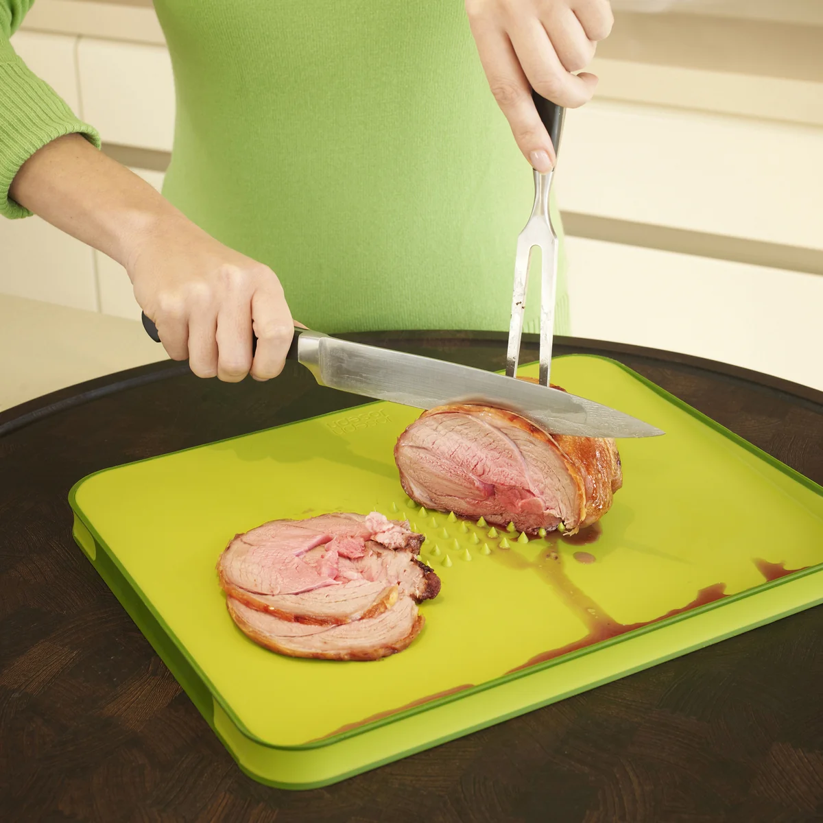The cutting board Cut & Carve Plus is made of polypropylene and can be easily placed in the dishwasher for cleaning. The design was developed by the company Joseph Joseph together with John Brauer.