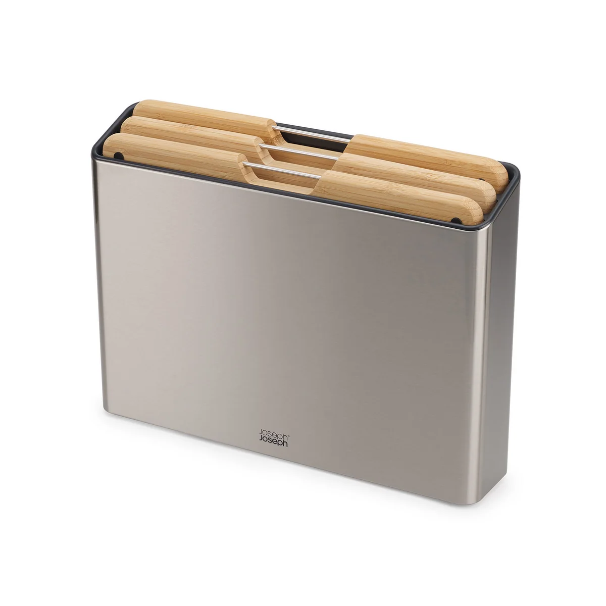 The Folio Steel cutting boards from Joseph Joseph help to keep order in the kitchen. Four different colored cutting boards are stored in a narrow stainless steel case and can be easily removed by a handle.