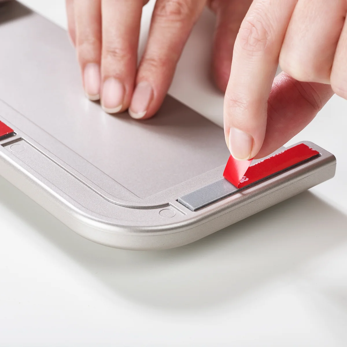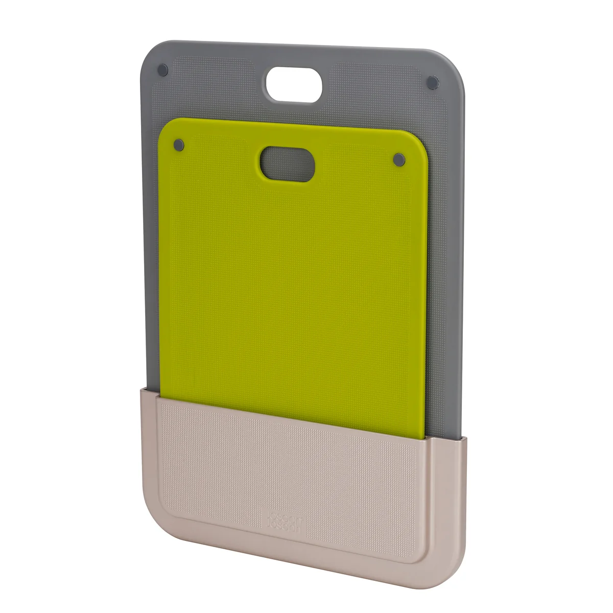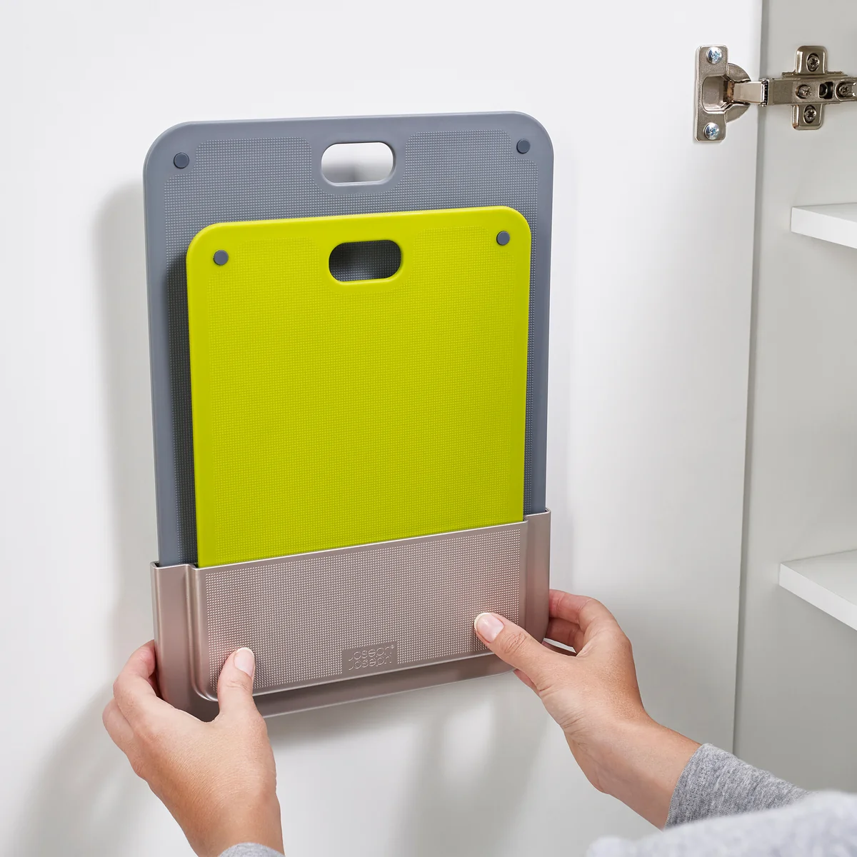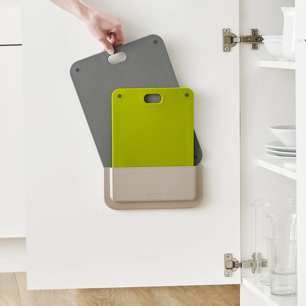 The DoorStore Chop chopping board set by Joseph Joseph creates space in the kitchen by hanging it space-savingly on the inside of the kitchen cupboard doors. The set consists of two cutting boards in different sizes and a slim storage box, which can also be used in narrower cupboards. No tools are required to attach the set, as the holder is attached with 3M VHB adhesive tape.