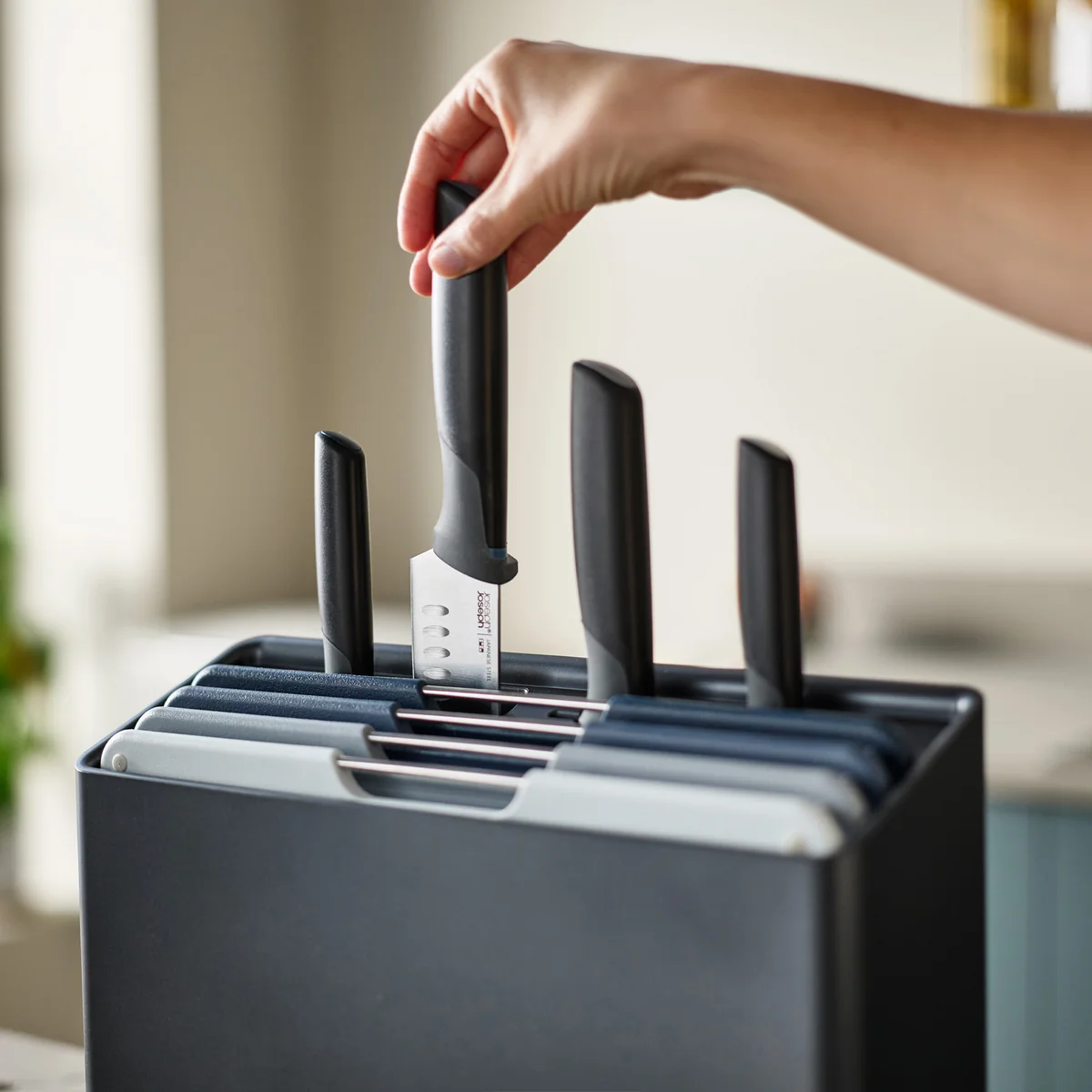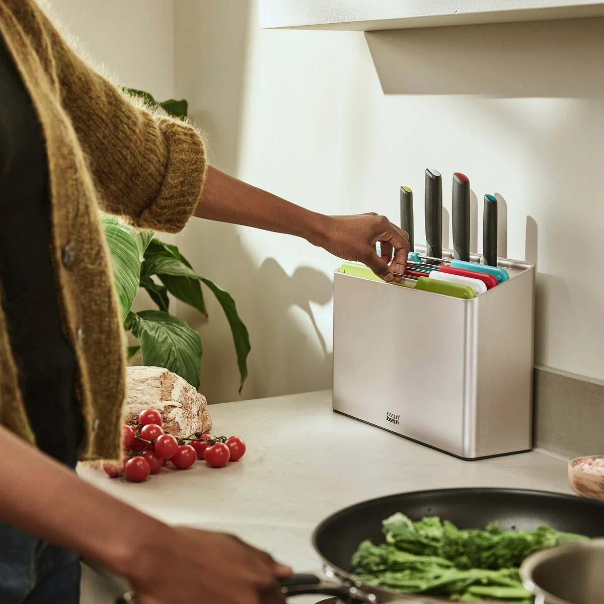 The Folio Plus knife and cutting board set from Joseph Joseph impresses with its elegant and absolutely practical design. The practical storage option for cutting utensils includes a slim storage stand with a total of four cutting boards, which are also color-coded, as well as four Elevate™ knives. Each cutting board features a knife-friendly textured side, stainless steel handles and non-slip feet. In addition, each knife has an exceedingly sharp Japanese stainless steel blade with ergonomic handle and integrated rest, which provides more hygiene in the kitchen.