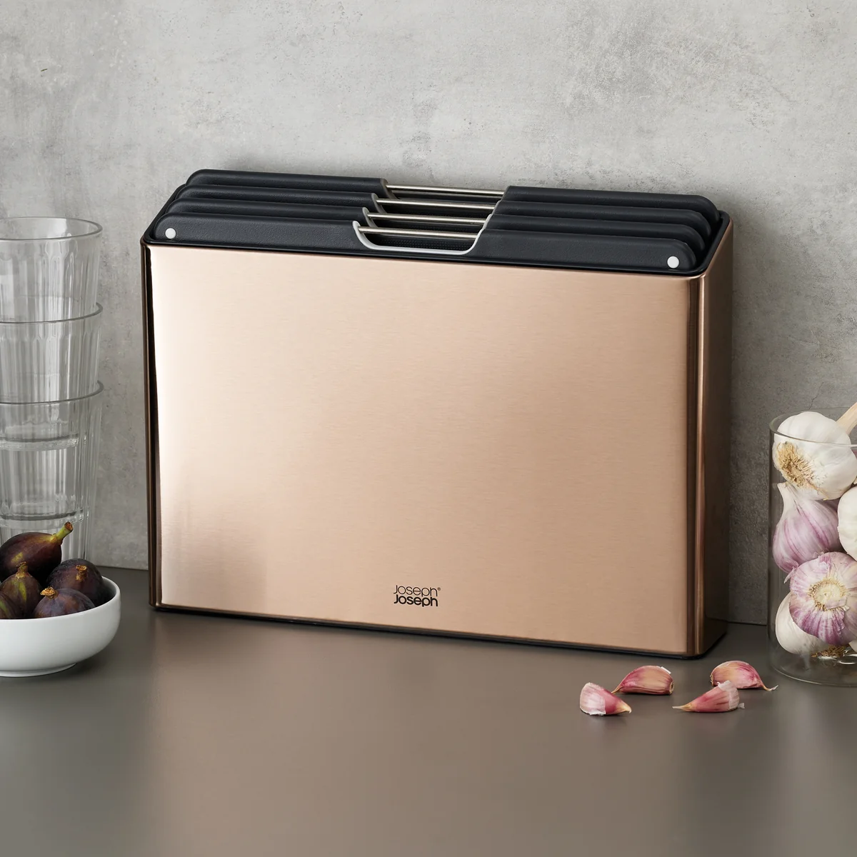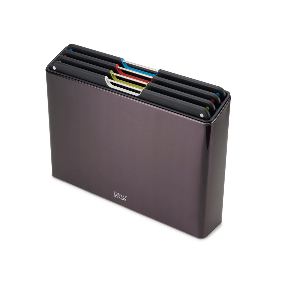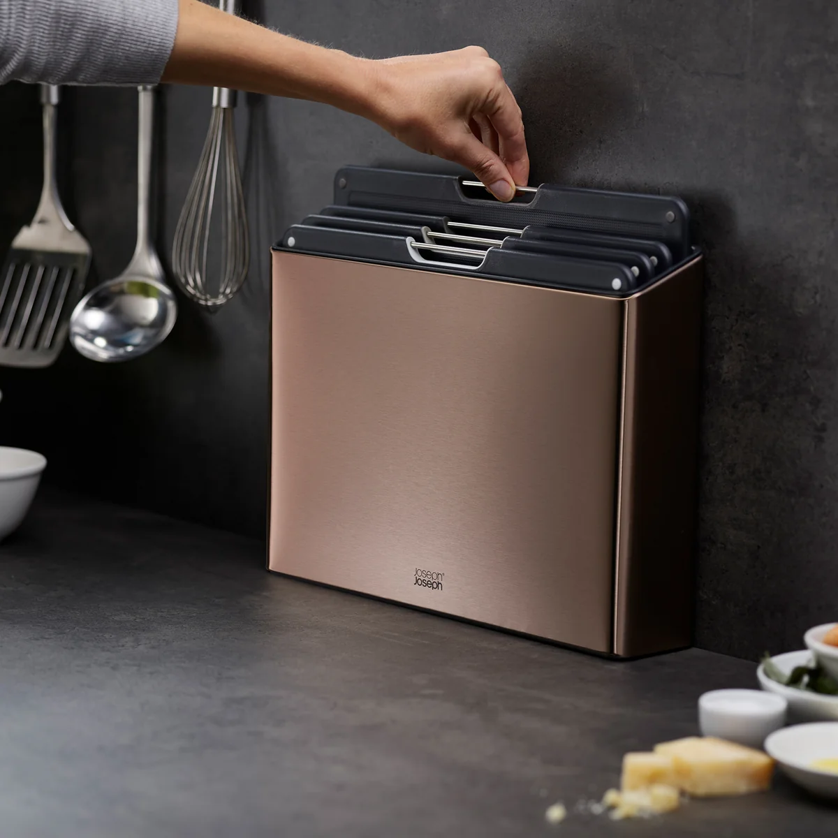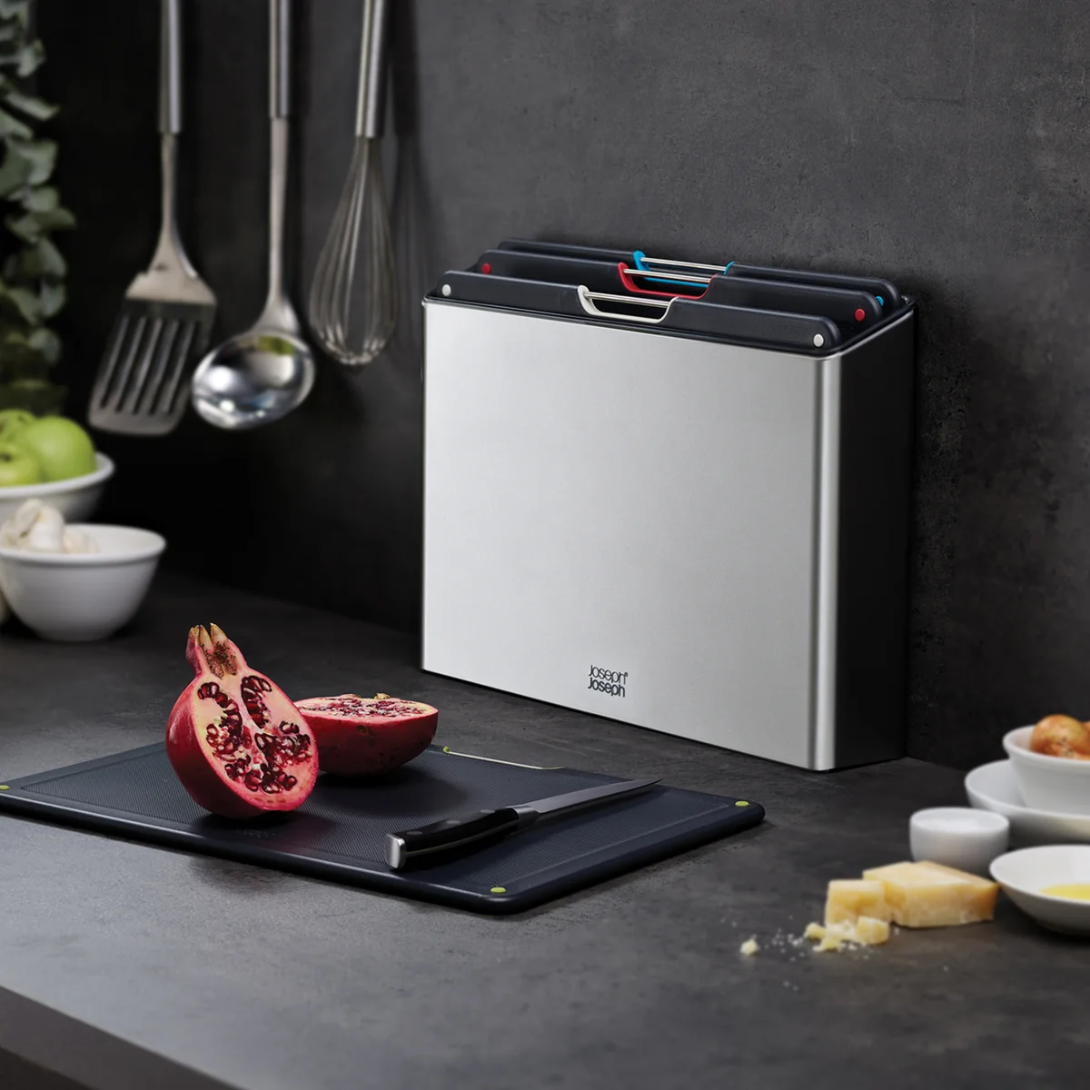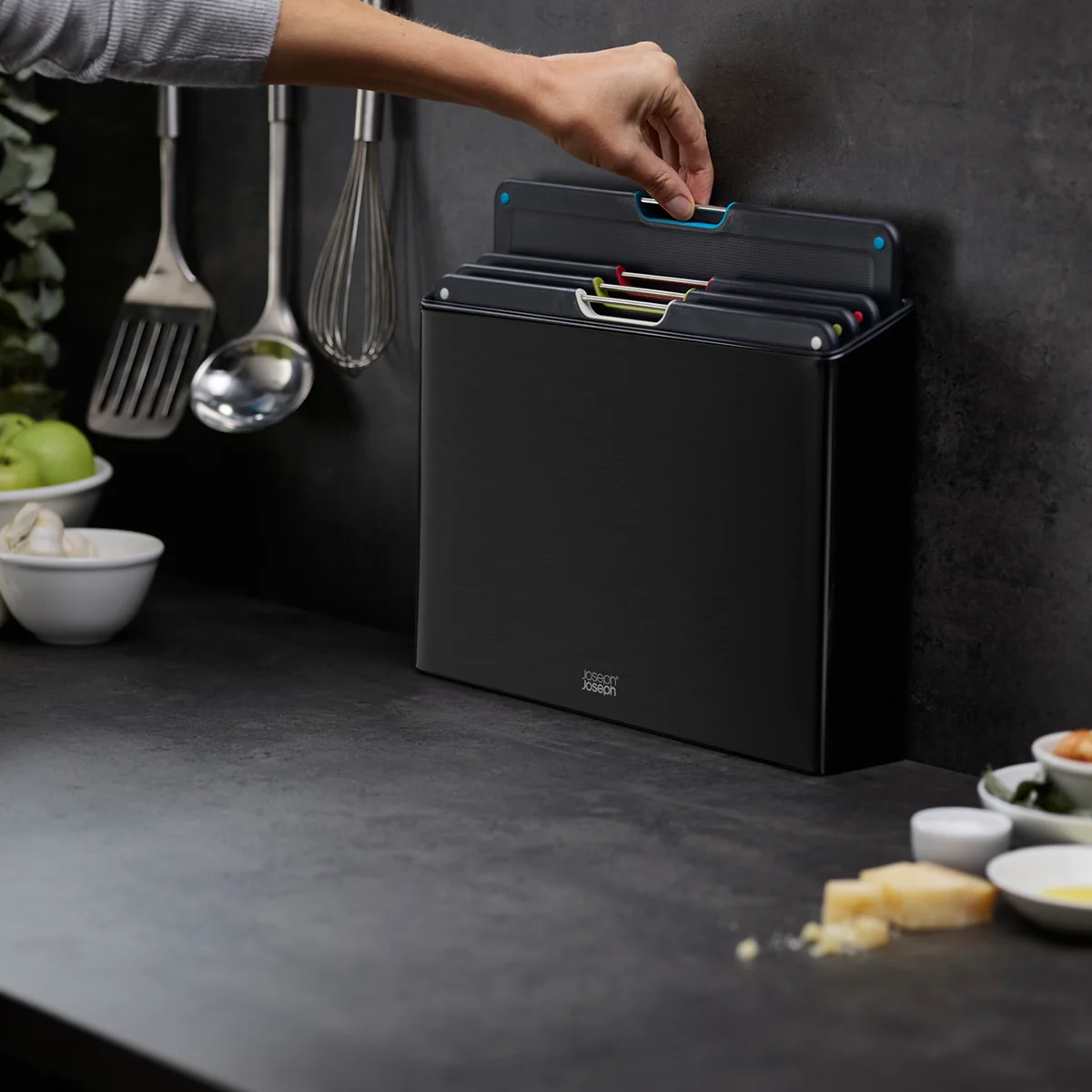 The Folio Steel cutting boards from Joseph Joseph help to keep order in the kitchen. Four different colored cutting boards are stored in a narrow stainless steel case and can be easily removed by a handle.