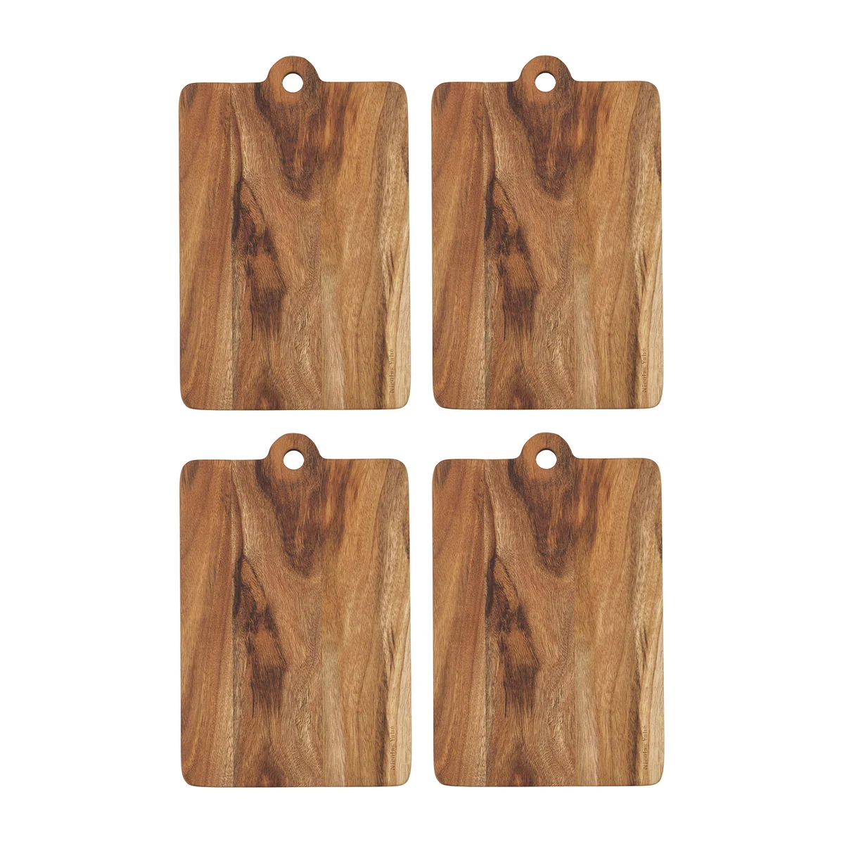 These beautiful Butter cutting boards from Nicolas Vahé are perfect for serving and as breakfast boards. The chopping boards are available as a set of 4. The boards are 18.5 cm long, 13 cm wide and 1.5 cm high. The chopping boards are made of acacia wood, which brings warmth and a rustic look to the dining table. In combination with one or more delicacies, the Butter -boards are also ideal as practical elements in a beautiful gift basket.