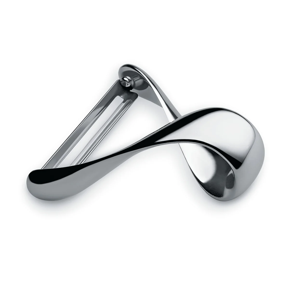 The shape of Sfrido, made of polished stainless steel, is reminiscent of a stylised ribbon that is gently winding and turns until it encloses the blade. Thanks to the curvature of the moving lines, the product can be held in a natural, ergonomic way. The user can decide how to hold the object. The peeler is suitable for all types of vegetables.