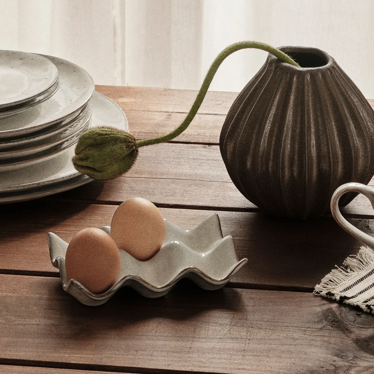 The Nordic Sand egg tray from Broste Copenhagen is a wonderful way to enhance the dining experience. This exquisite piece made from high-quality, reactive glazed stoneware has a soft beige hue that radiates tranquillity. The unique surface ensures that each tray has its own distinctive pattern and character.