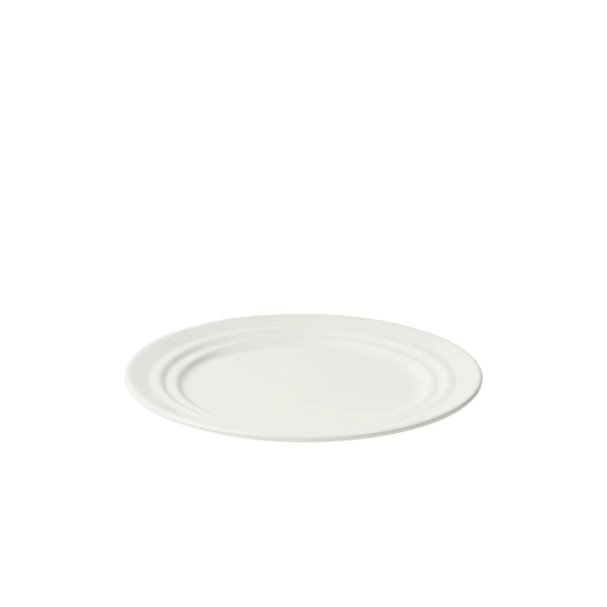 The collection, made from white stoneware and finished with a Chalk White glaze, adds an inviting touch to the table. Danish ceramist Julie Bonde designed this series, which artfully frames the plates with its two distinctive rings.