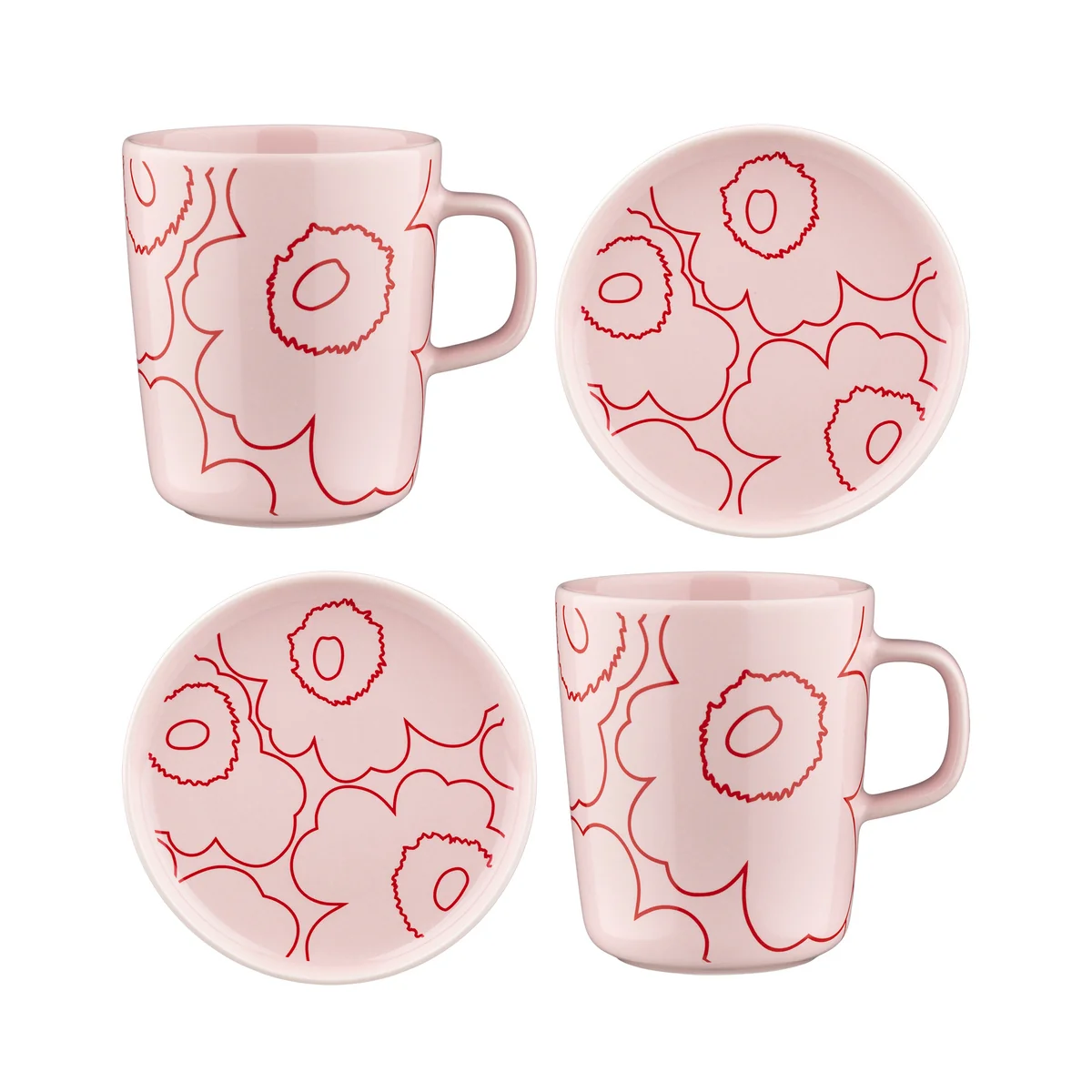 The Piirto Unikko Oiva tableware set includes two cups (2.5 dl) and two plates (13.5 cm), made of high-quality ceramic with a pink glaze. The set is practical and versatile as it is dishwasher, oven, microwave and freezer safe. It is packaged in an elegant Marimekko gift box, ideal as a stylish gift.