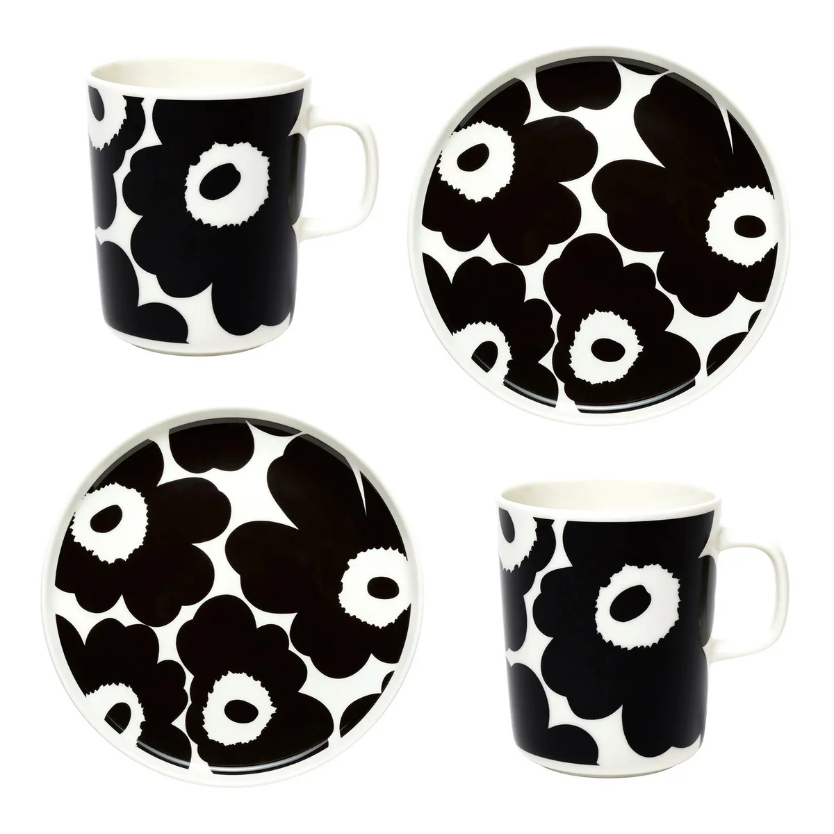 The dinner set includes two cups (2.5 dl), two deep plates (20.5 cm) and two dinner plates (25 cm) - ideal for cozy evenings or special occasions. The breakfast set contains two large cups (4 dl) and two plates (20 cm), perfect for starting the day. Both sets are packaged in an elegant box with the Marimekko logo and also make a wonderful gift.