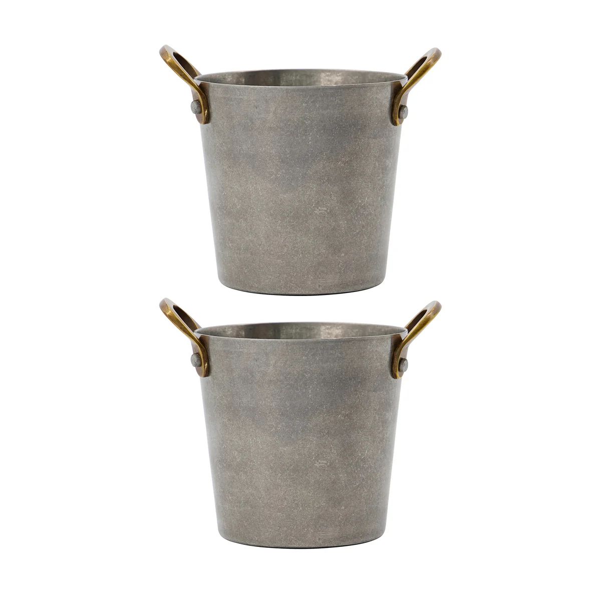 The Presentation Buckets from Nicolas Vahé are ideal for serving chips, side dishes or tapas in individual portions. With their stainless steel material and brass handles, they give the table setting a rustic look reminiscent of the atmosphere of a cozy pub. This mini cookware collection allows dishes to be presented perfectly plated straight from the oven, providing guests with a unique dining experience. In a successful dinner, it is not only the taste that counts, but also the right presentation. The Presentation buckets are heat resistant up to 250°C and are suitable for both electronic ovens and ovens with convection function. They are also suitable for electric and gas stoves, but not for induction hobs. Please rinse by hand and note that some color loss may occur over time due to heat exposure, which is normal for stainless steel and has no effect on safety or function. Make your dinner a visual and culinary highlight with the Presentation Buckets from Nicolas Vahé .