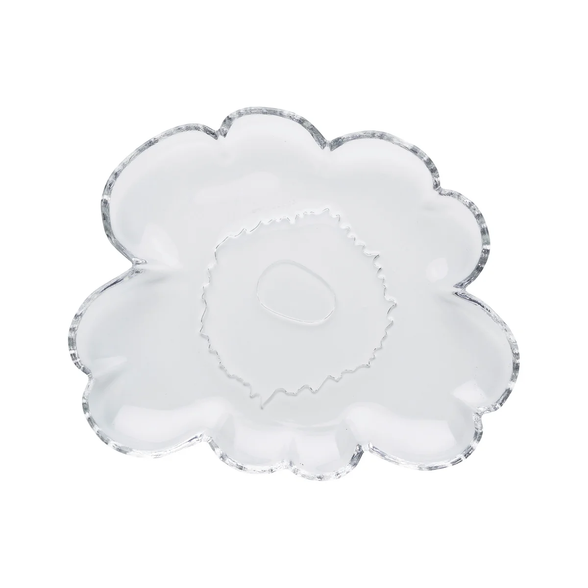The flower-shaped Unikko glass plate from Marimekko . It is recommended to wash this plate by hand to preserve its unique design. It can be cleaned in the dishwasher, but please be careful as the distinctive design can be damaged if it comes into contact with other dishes.