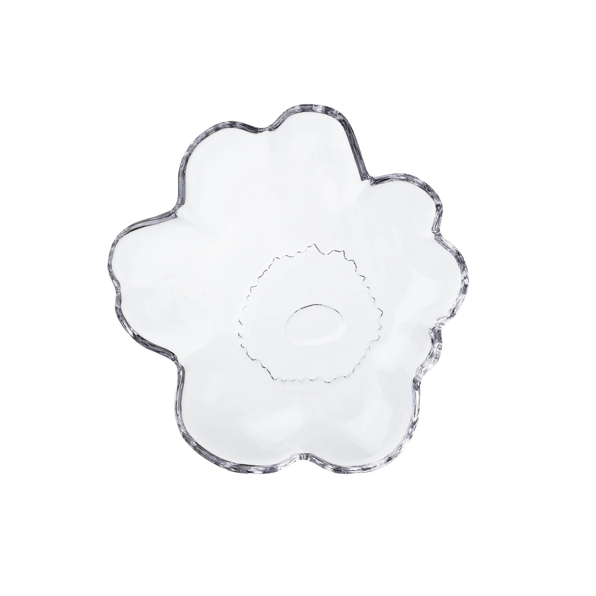 The flower-shaped Unikko glass plate from Marimekko . It is recommended to wash this plate by hand to preserve its unique design. It can be cleaned in the dishwasher, but please be careful as the distinctive design can be damaged if it comes into contact with other dishes.